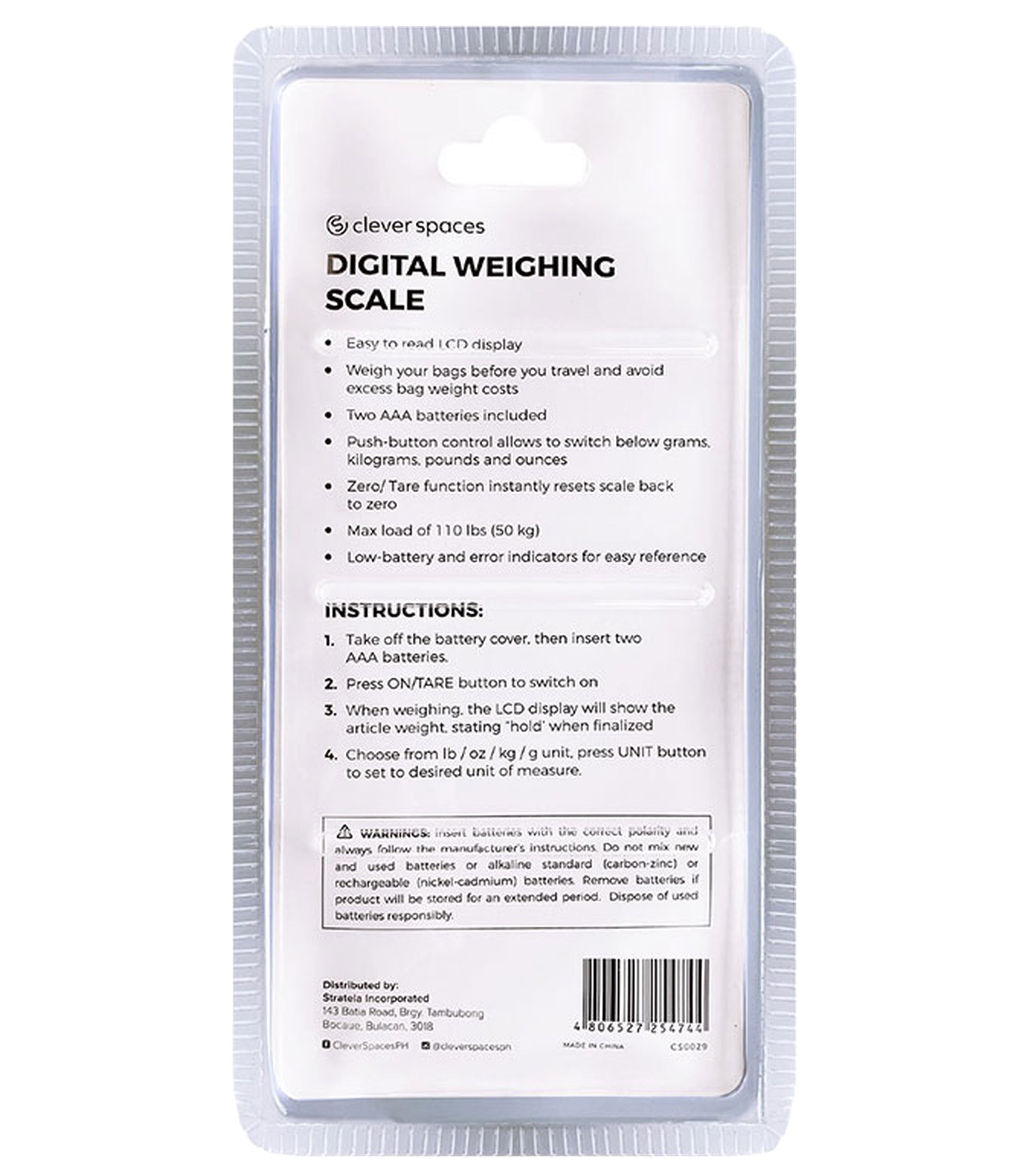 With its easy-to-read LCD display, this scale is your ticket to stress-free travel. Our scale offers push-button control, allowing you to switch between grams, kilograms, pounds, and ounce6) s effortlessly. The zero/tare function ensures an accurate measurement every time. With low-battery and error indicators, you'll always know when it's time for a battery change or if an issue arises. Max Load of 110 lbs (50 kg) so you can be sure you're within airline weight limits. Batteries Included: comes with 2x AAA batteries, ready to power your travel plans. Usage Instructions: Remove the battery cover and insert 2x AAA batteries (included). Press the ON/TARE button to switch on the scale. When weighing, the LCD display will show the article weight, displaying "hold" when the measurement is finalized. Choose from lb / oz / kg / g units by pressing the UNIT button to set your desired unit of measure.