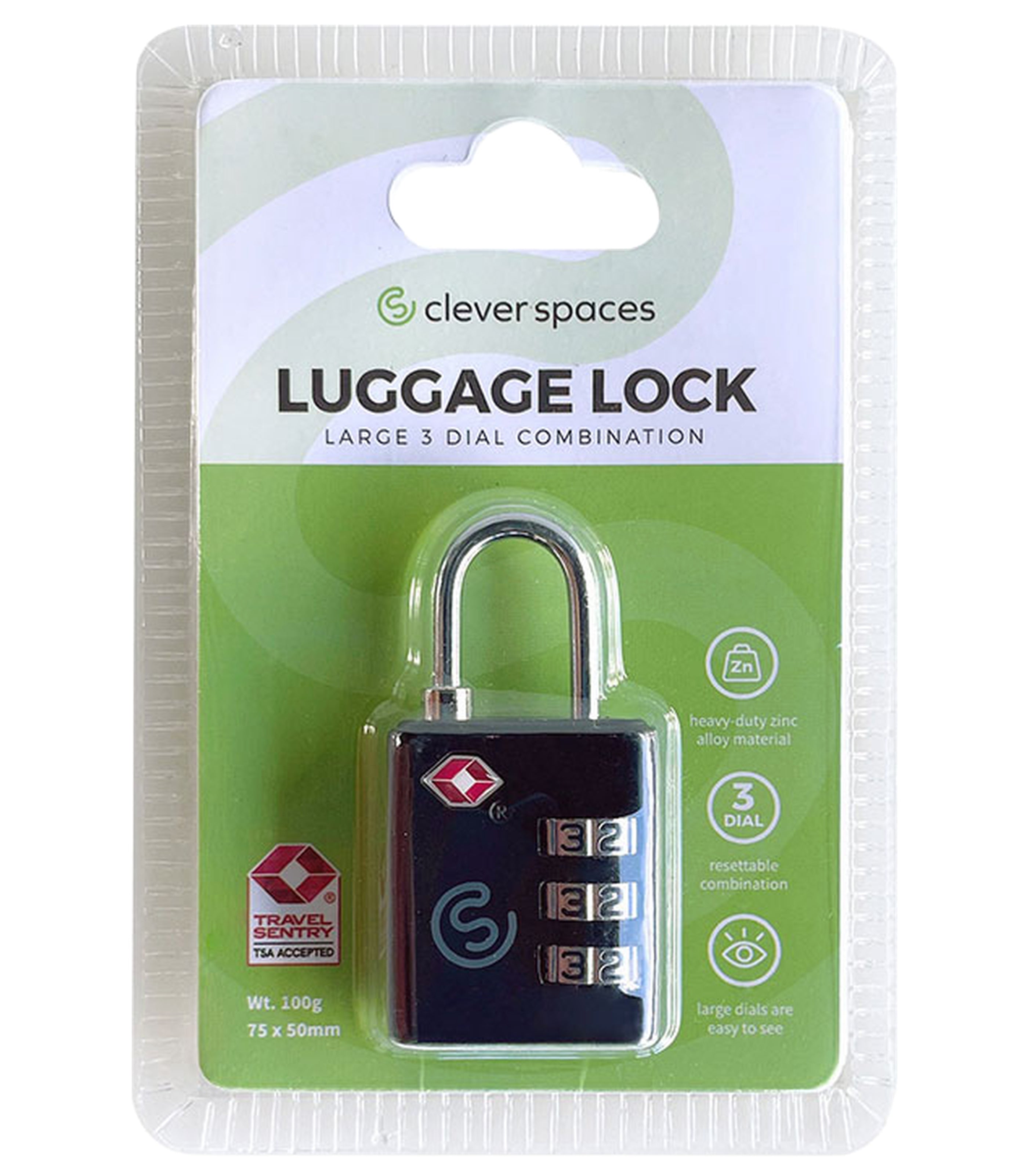 Built to Last: Our commitment to quality shines through in the construction of this lock. Crafted from heavy-duty zinc alloy material, it's designed to withstand the rigors of travel, keeping your belongings safe and sound. Resettable 3-Dial Combination: The Clever Spaces® lock features a resettable 3-dial combination, allowing you to create a code that's easy to remember but impossible to guess. Easy-to-Read Large Dials: Our lock features large dials that are easy to read. Dimensions: 75x50mm, weight 100g