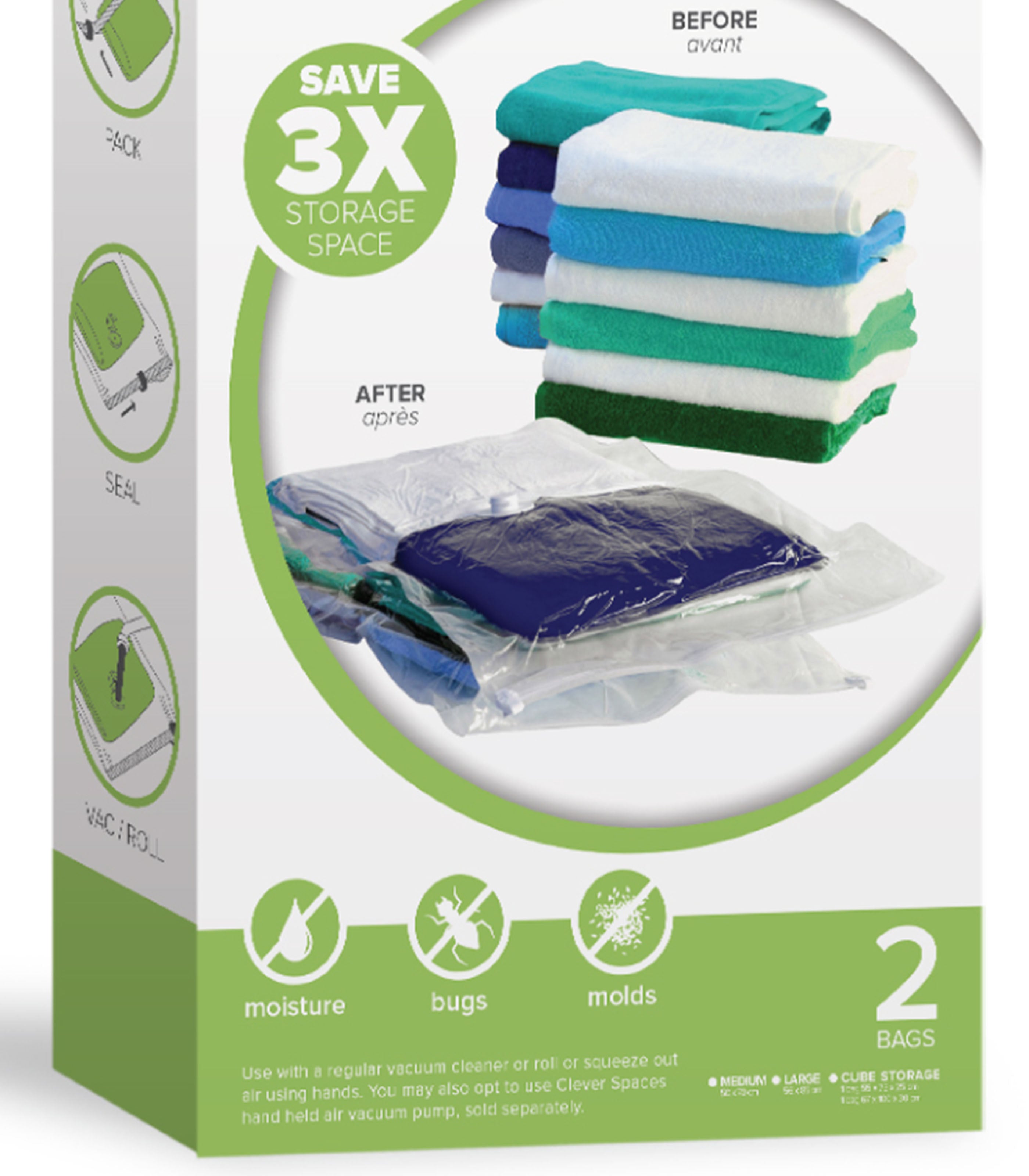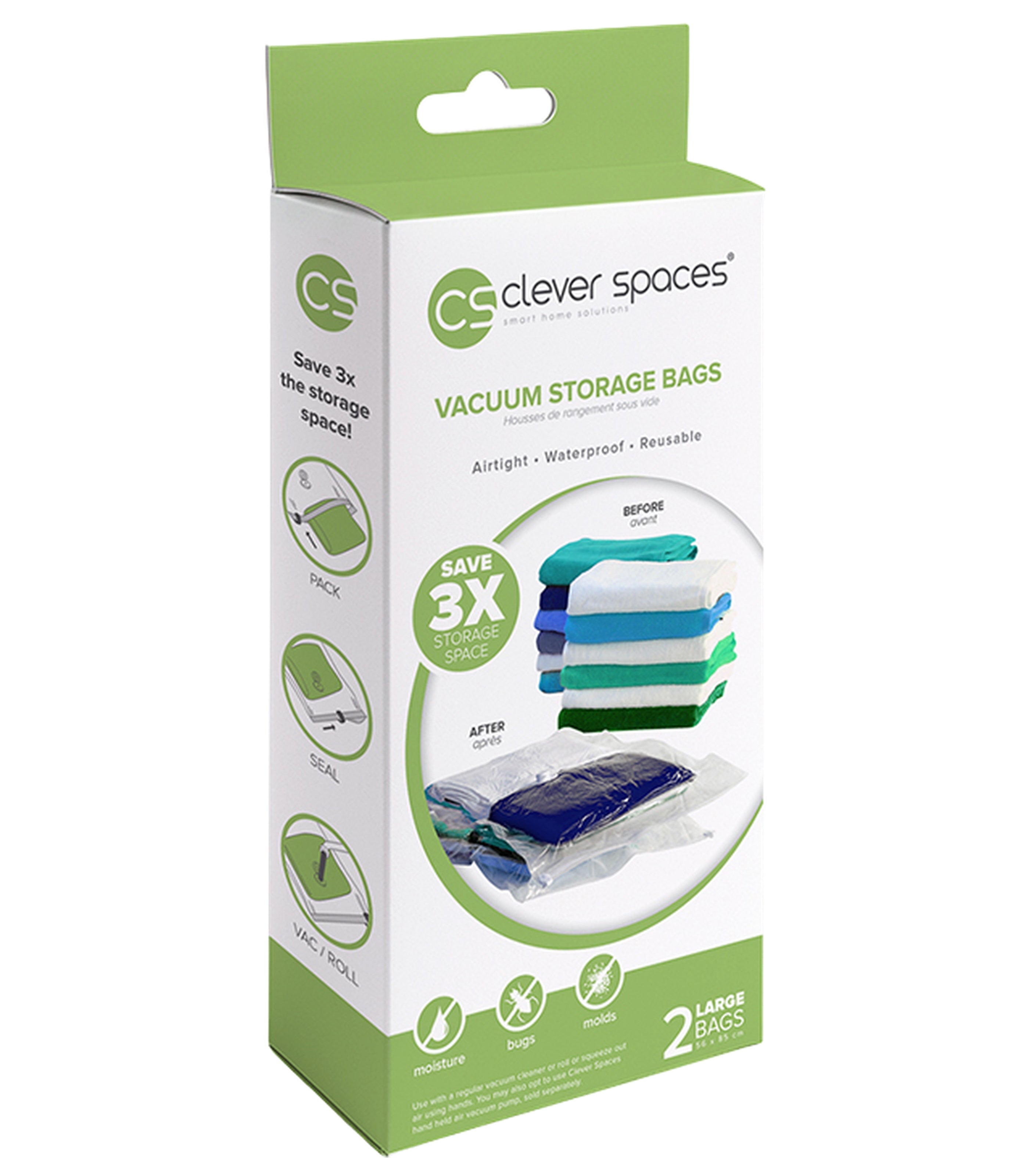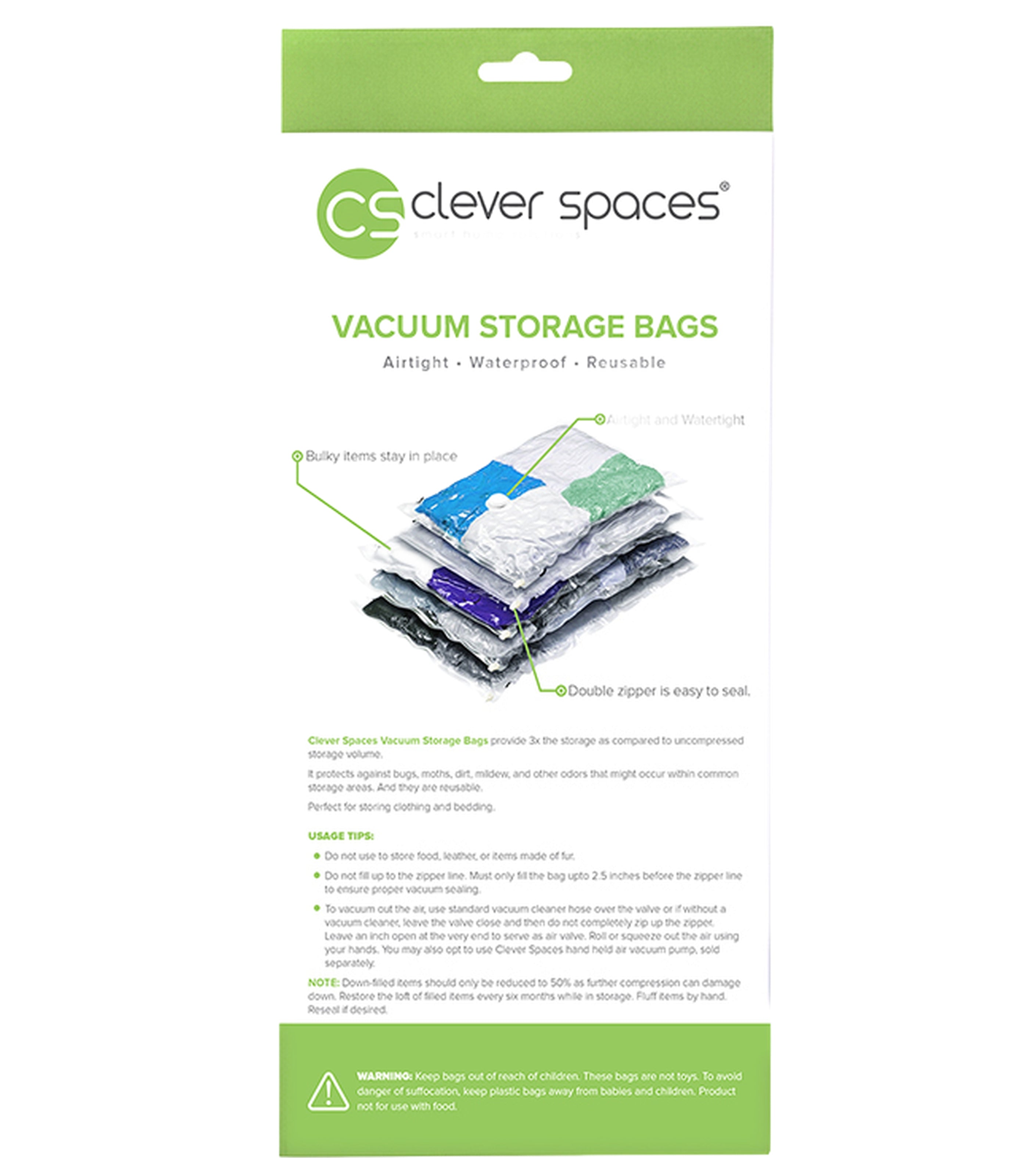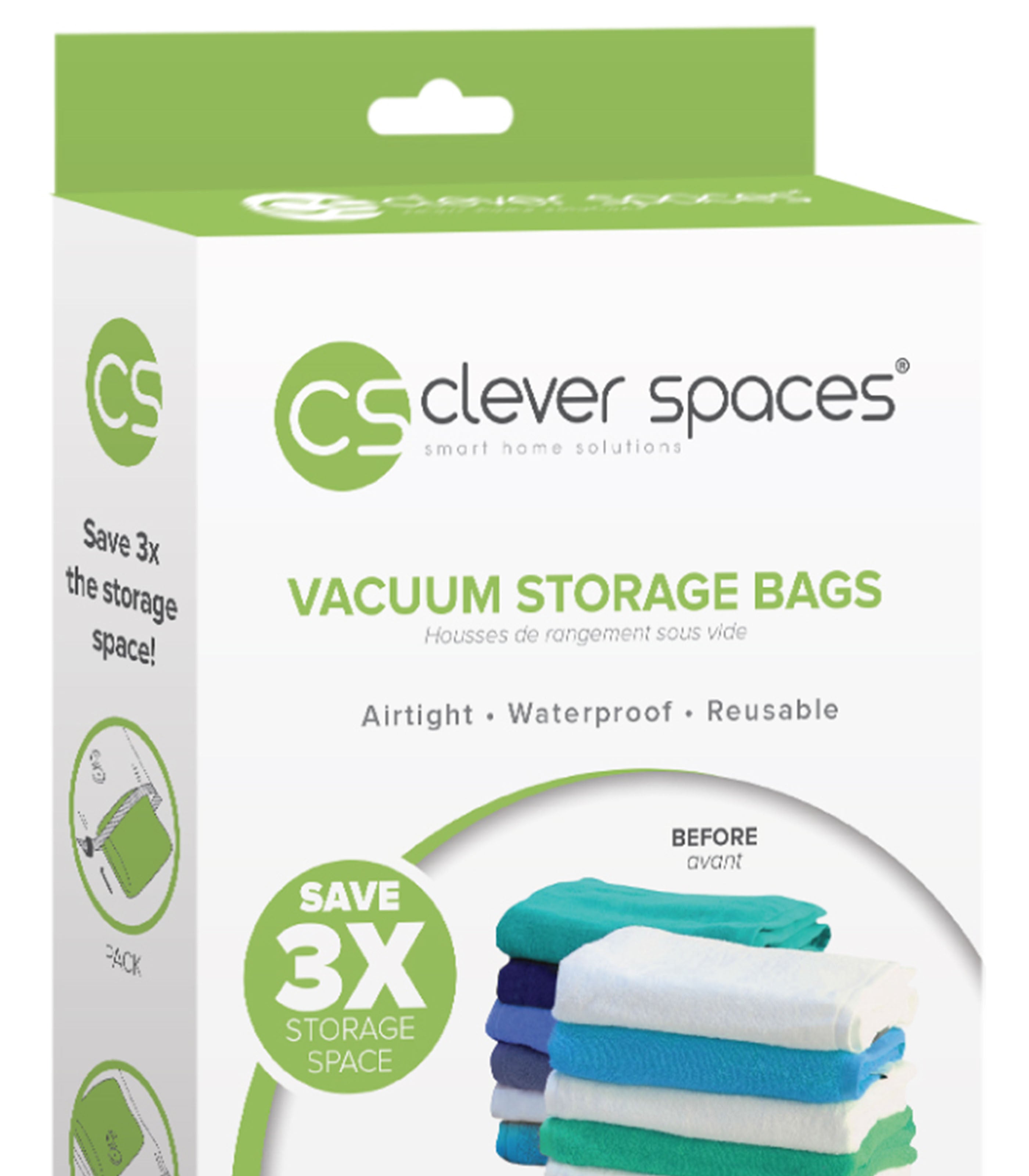 Clever Spaces are reusable vacuum storage bags that can save you up to 3x of storage space. Just use with a regular vacuum or our Clever Spaces Hand Pump (sold separately) to pump out the air and vacuum seal the bags.
