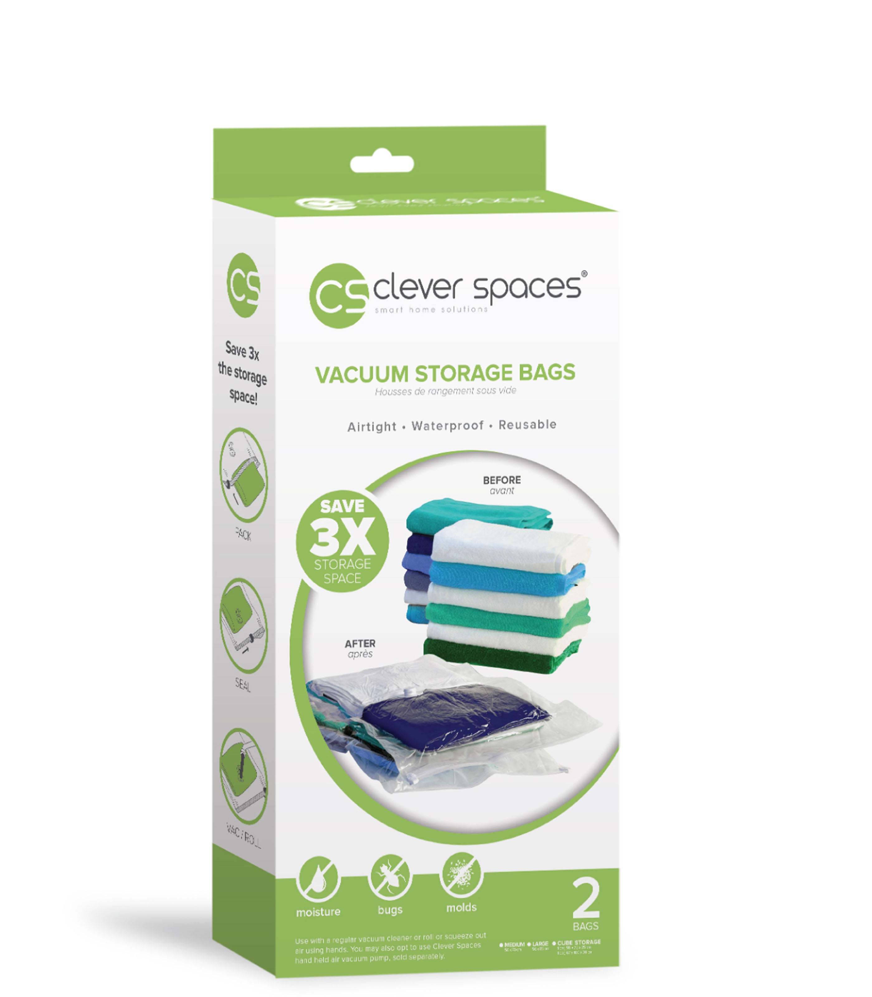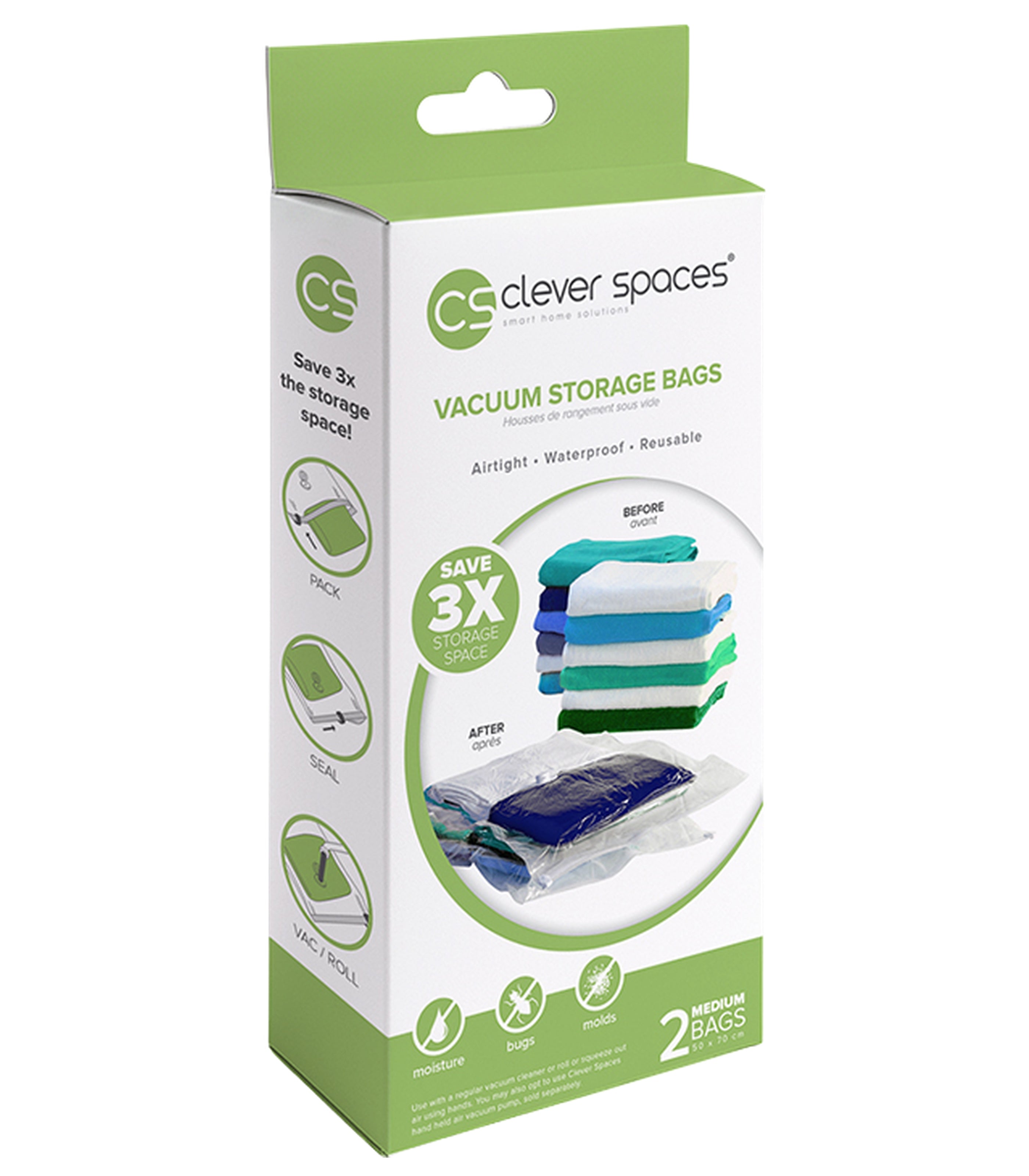 Clever Spaces are reusable vacuum storage bags that can save you up to 3x of storage space. Just use with a regular vacuum or our Clever Spaces Hand Pump to pump out the air and vacuum seal the bags.