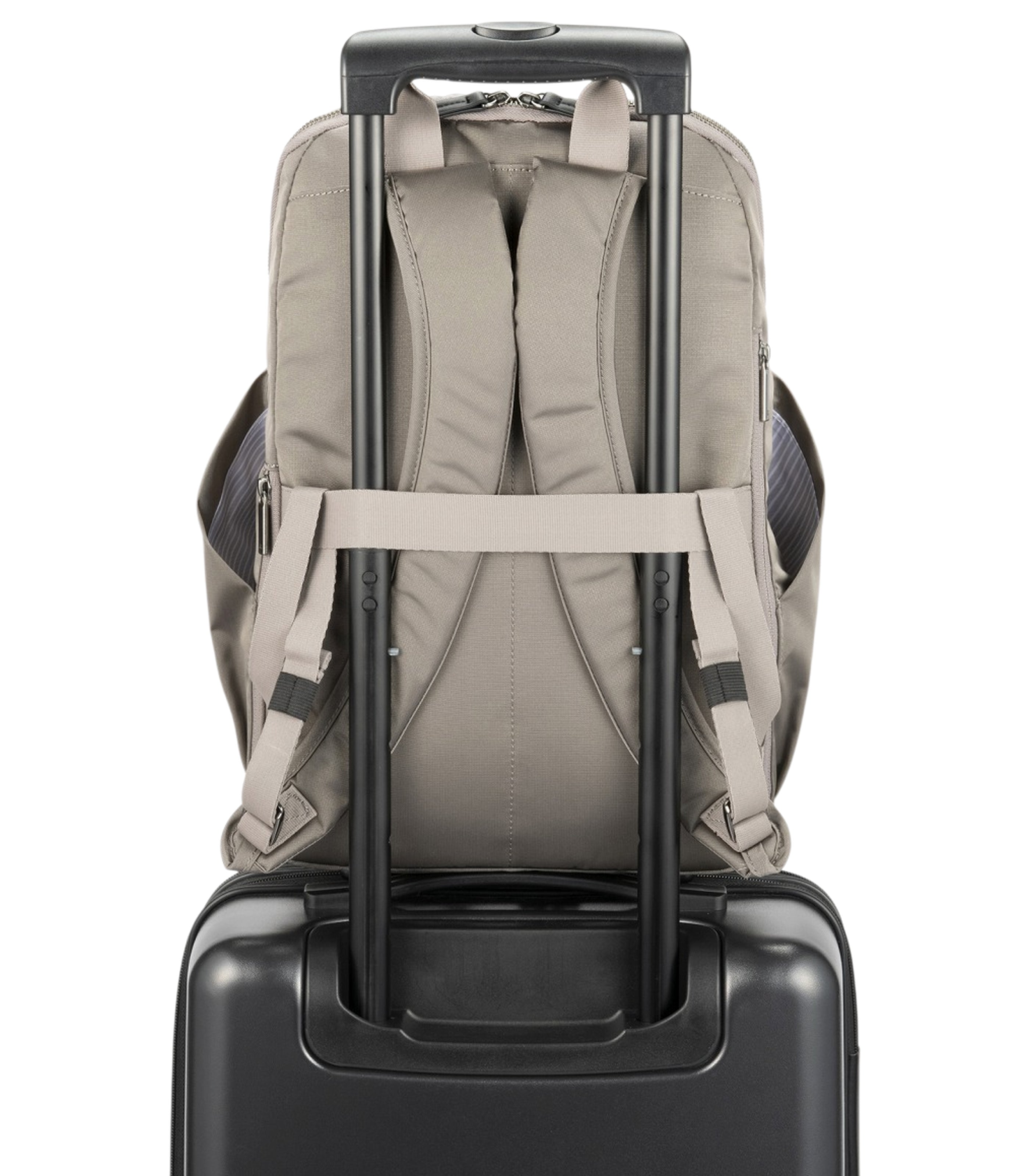 The Lufila commuter backpack is an ultra-lightweight (480g), water-repellent bag, ideal for business and casual use. Its single-compartment design easily stores a 14.0-inch laptop and utilizes the specially designed Universal Harness for a comfortable, snug fit that reduces perceived weight. Features include a 2-Way Through Pocket, an internal bottle holder, a quick-access front pocket, and a Setup Function for attaching to suitcase handles.