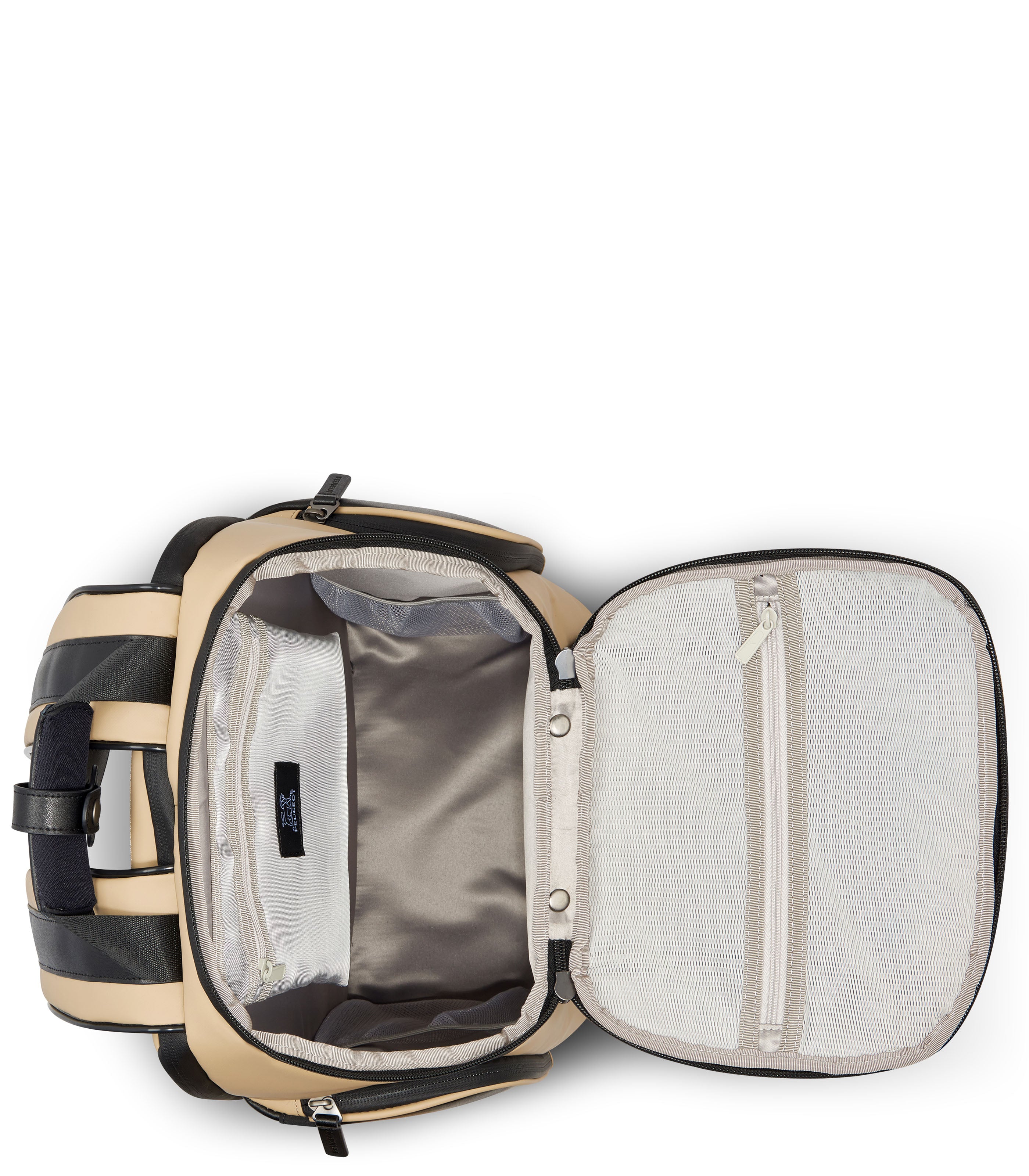 The backpack shape is based directly on the trunk case architecture. The inverted opening simplifies access to the contents. *