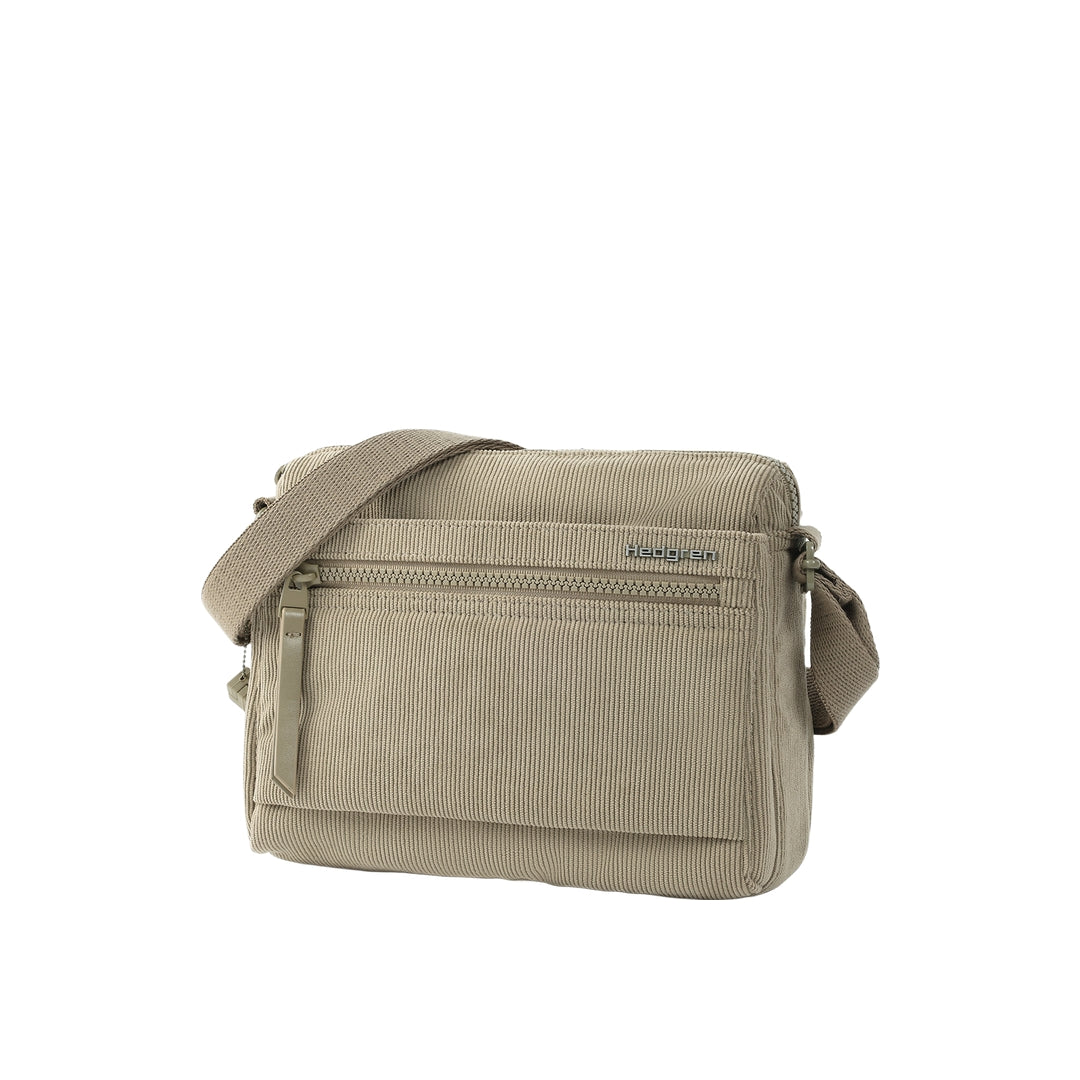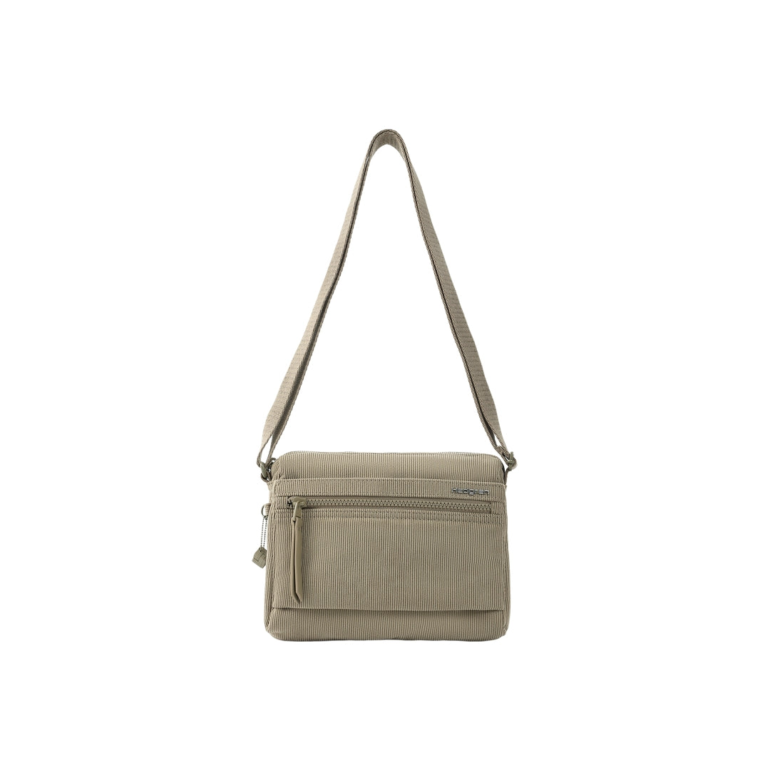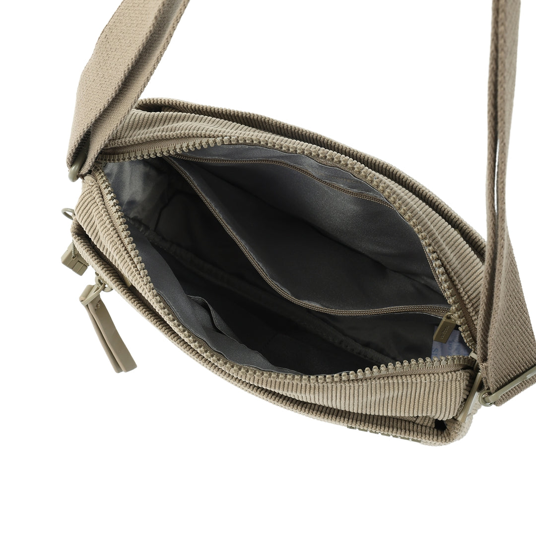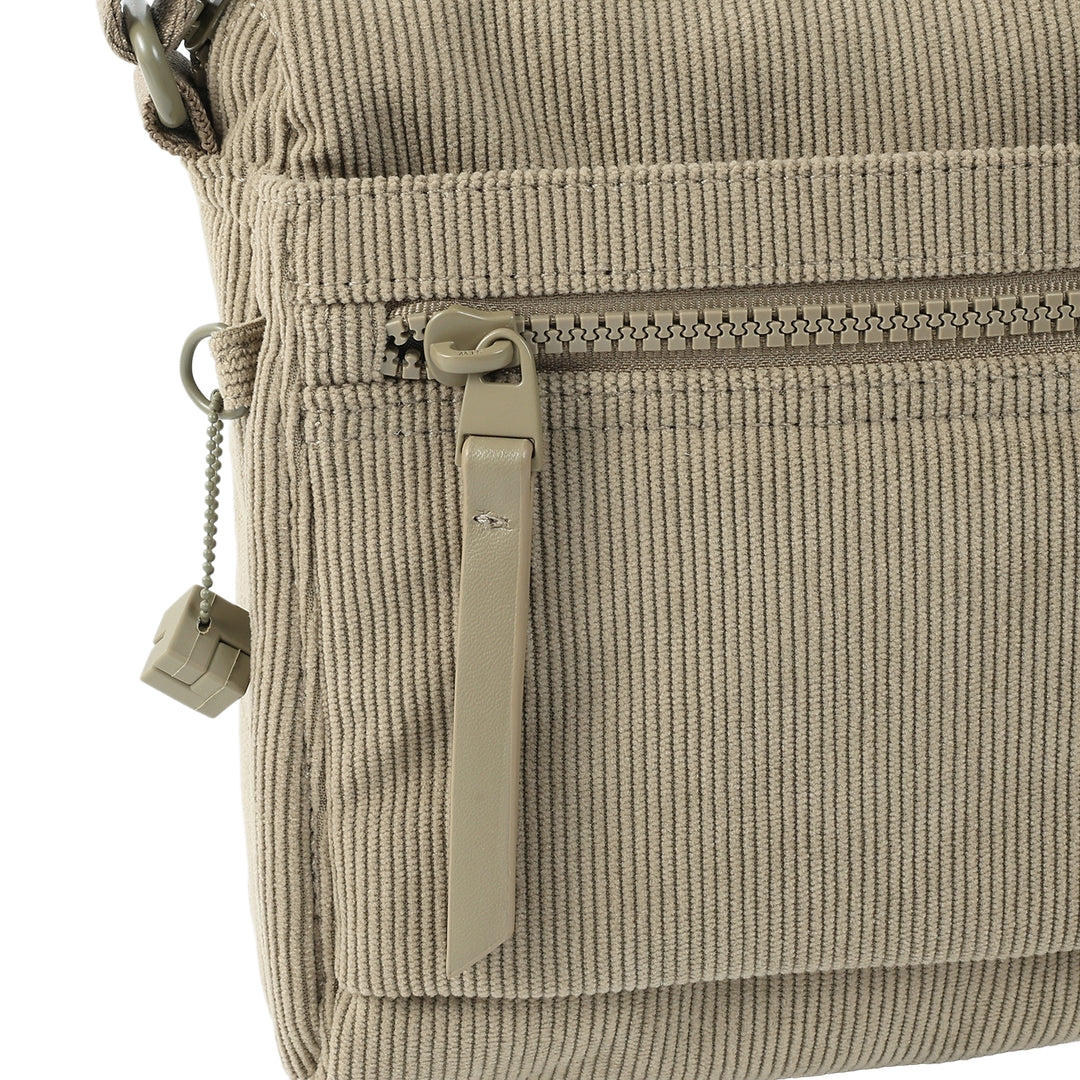 INTERIOR FEATURES One interior zipped pocket with RFID blocking material Two open pockets in main compartment EXTERIOR FEATURES Wear as a crossbody or a shoulder bag. Four exterior zippered pockets Tone-on-tone hardware Water and dust repellent fabric L 16 x W 10 x H 22 cm