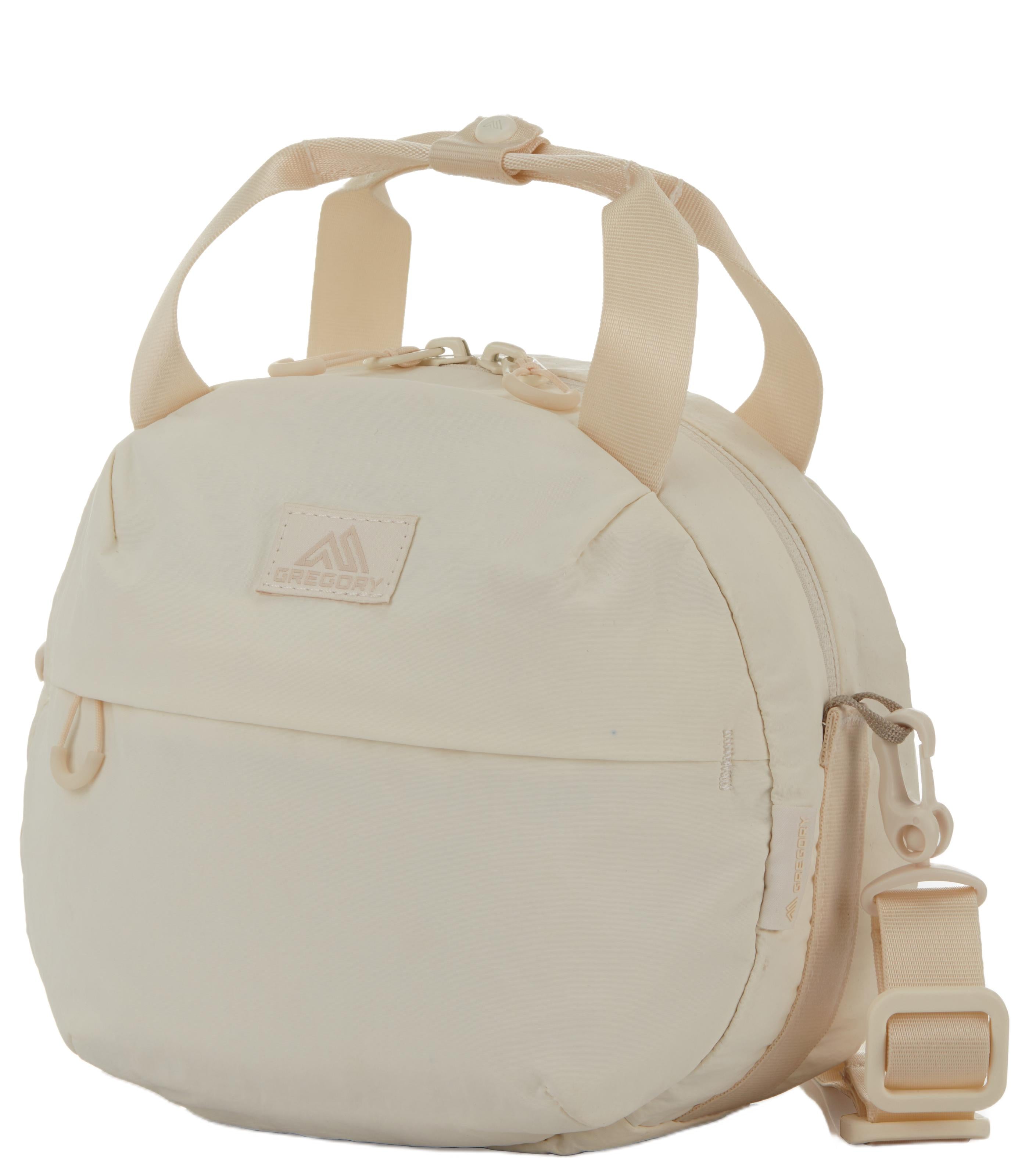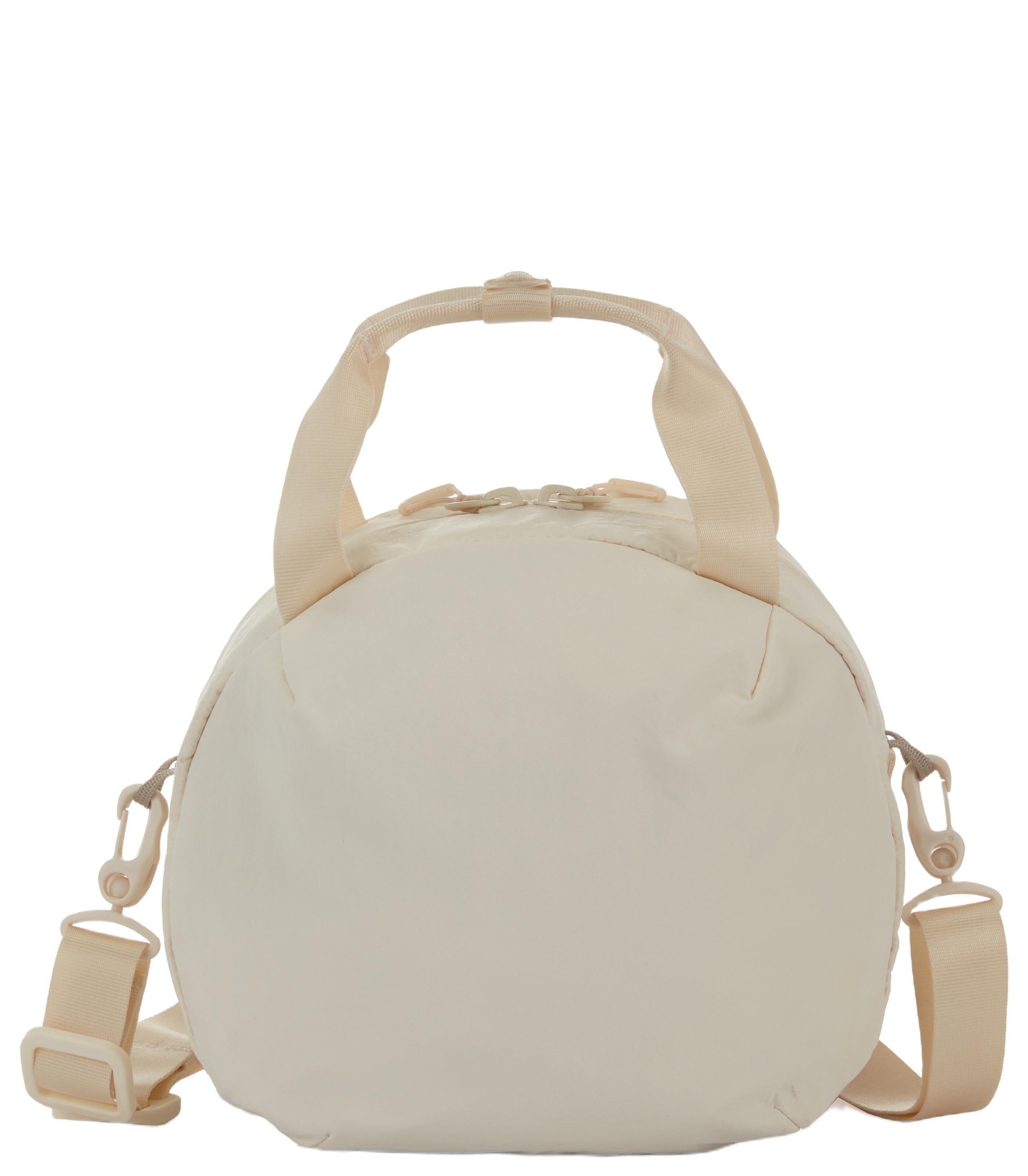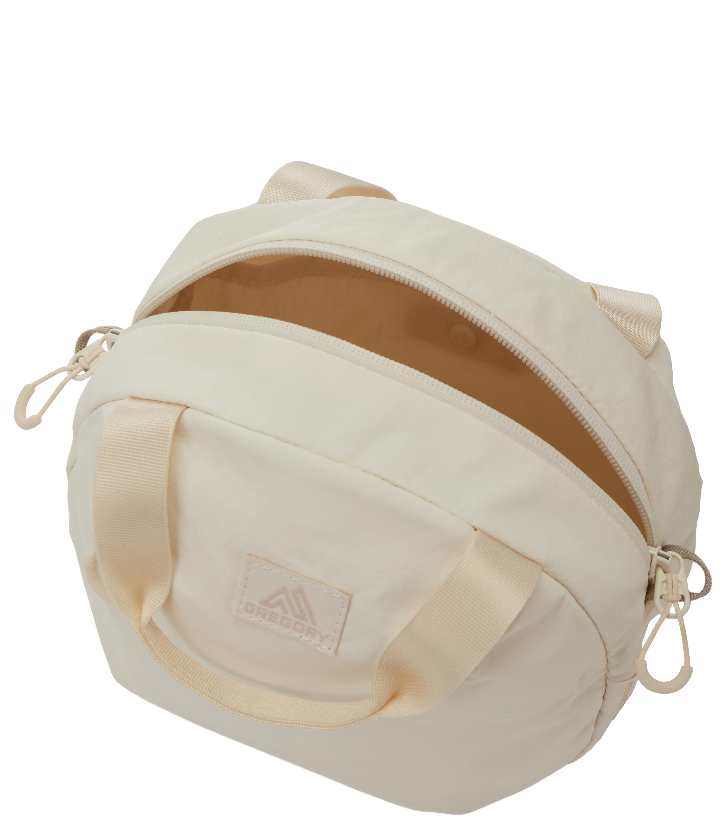 -repellent nylon fabric > Simple, clean design for light weight and functionality > Teardrop zipper pulls are simple yet easy to use. > Detachable shoulder strap. Can also be used as a handbag. > Front pocket with key fob. > Round shape that stands alone on the table > Made of environmentally friendly materials > Number of pockets: 2 (1 outside / 1 inside)