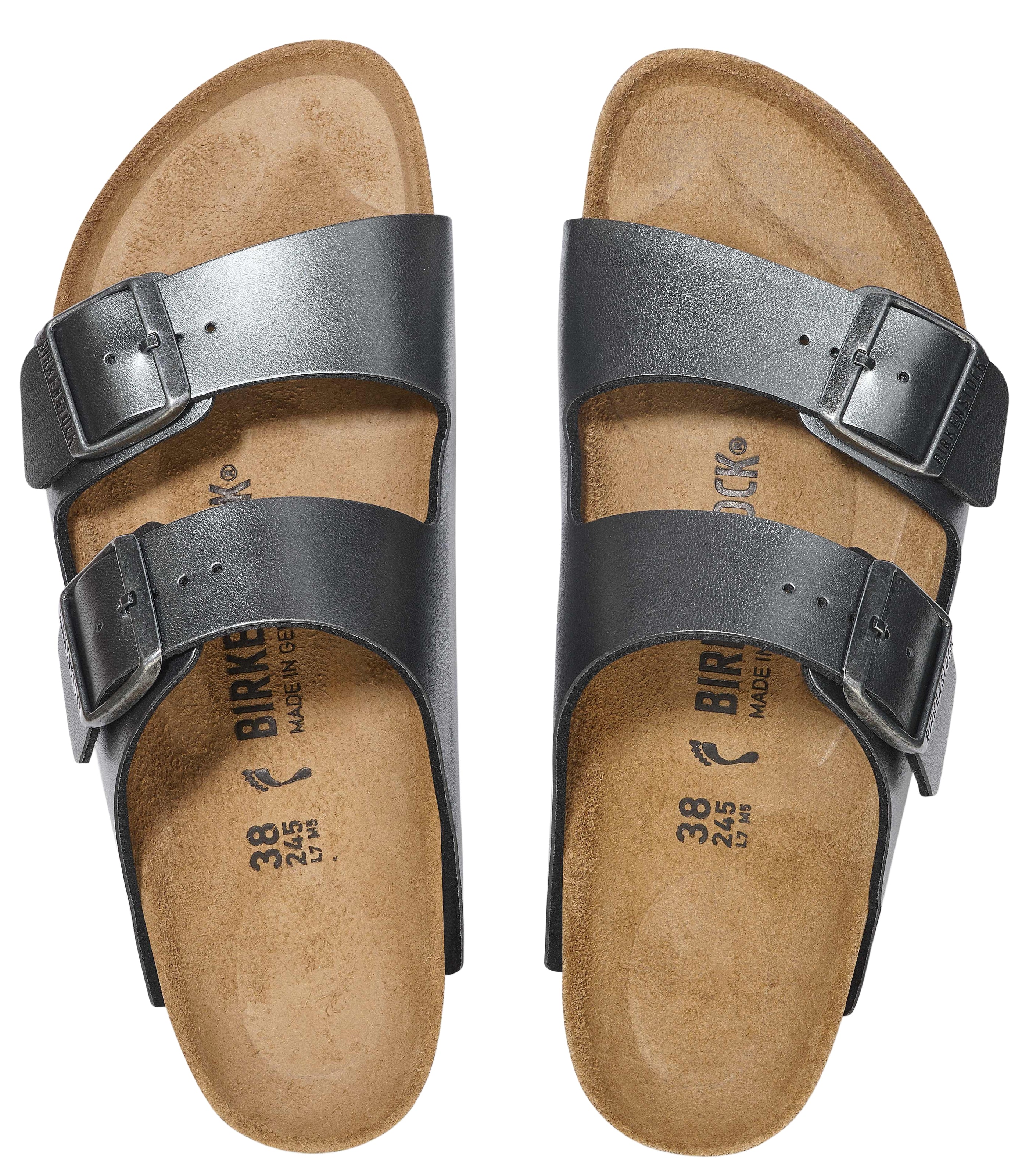 - Smooth leather upper with metallic finish {n} - Suede footbed lining helps keep you comfortable {n} - EVA sole is flexible and lightweight {n} - Two adjustable straps with tonal metal pin buckles {n} - “Made in Germany” quality stamp on footbed {n}