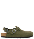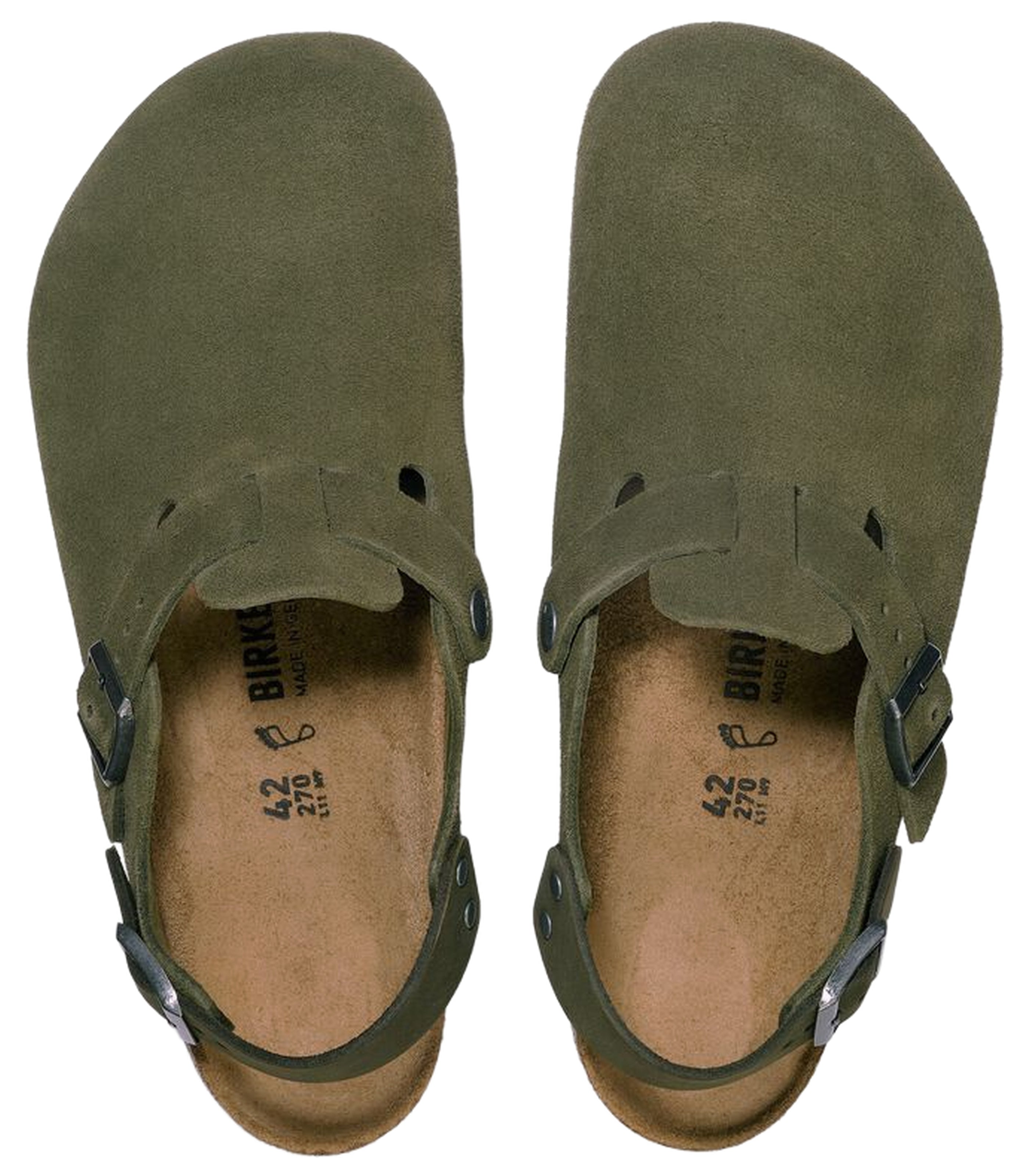 - Anatomically shaped cork-latex footbed {n} - Upper: suede {n} - Footbed lining: suede {n} - Sole: EVA {n} - Details: individually adjustable metal pin buckles {n} - “Made in Germany” {n}