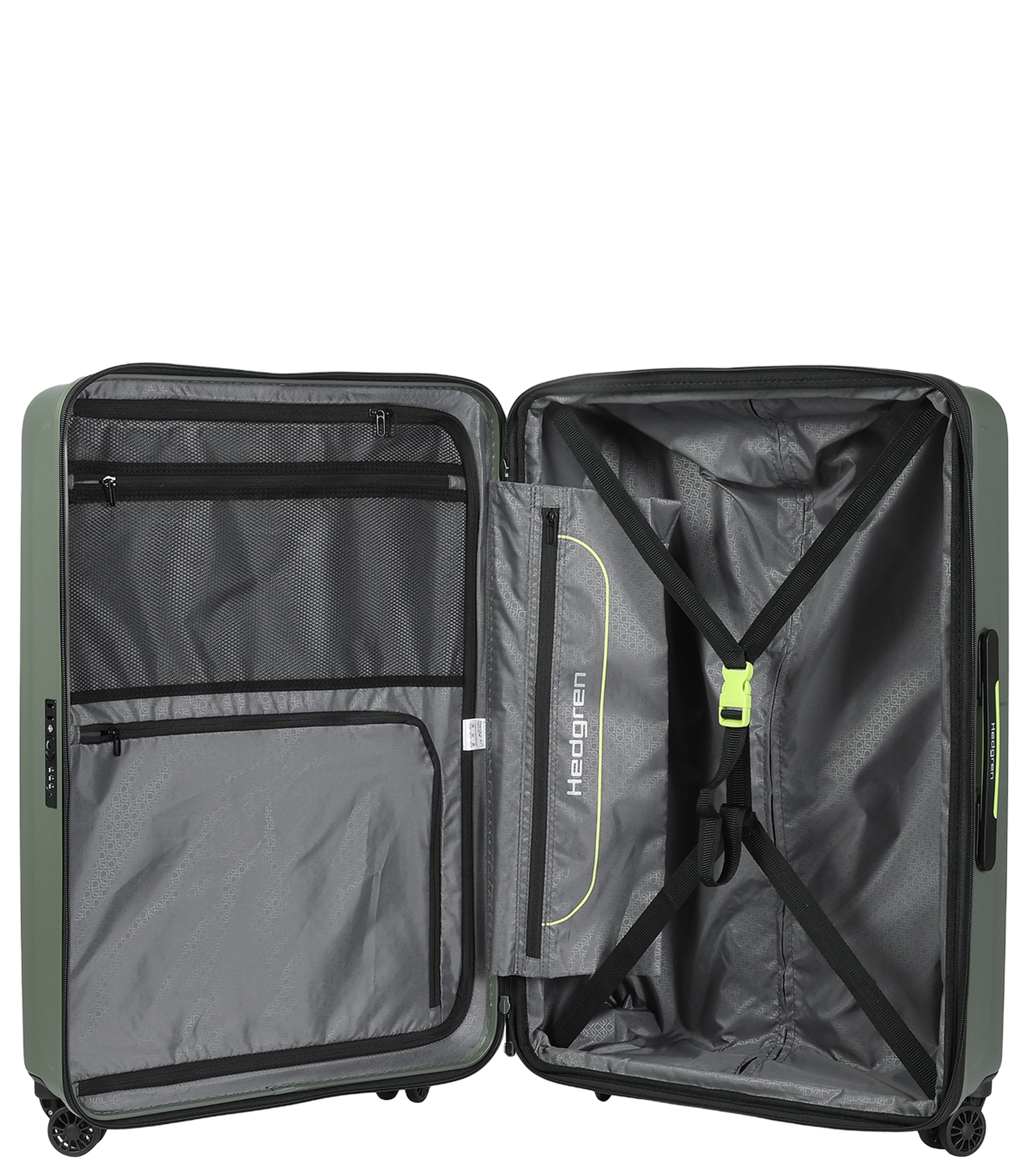 -down packing straps, a zipped divider and 3 zipper pockets. EXTERIOR FEATURES