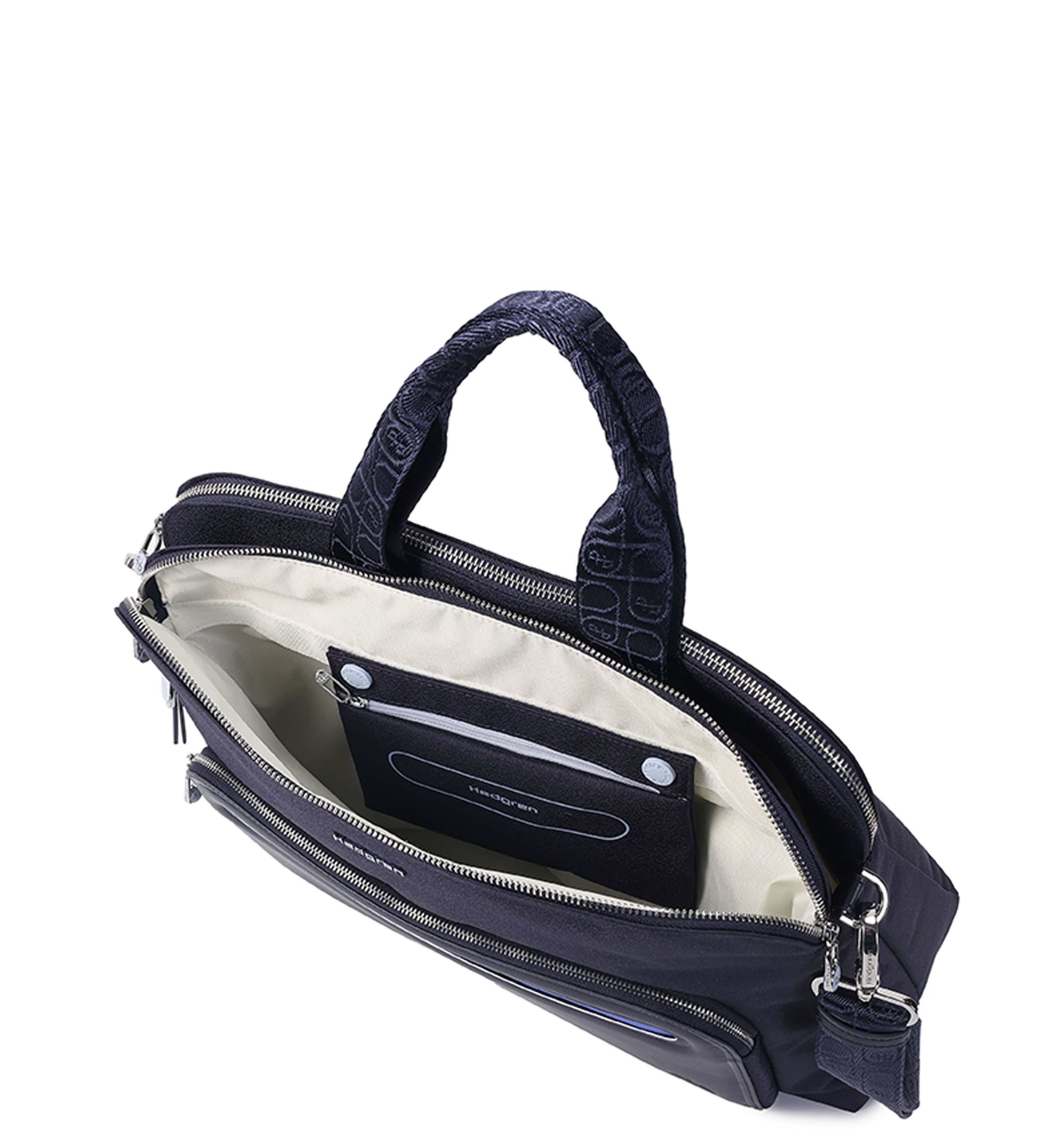 Lungo is the largest and most organised model out of the Fika collection. This model offers a double compartment business organisation with padded laptop sleeve, secure locking zippers and smart sleeve function. Lungo comes with webbing bail handles and a detachable and wide, webbing shoulder strap.