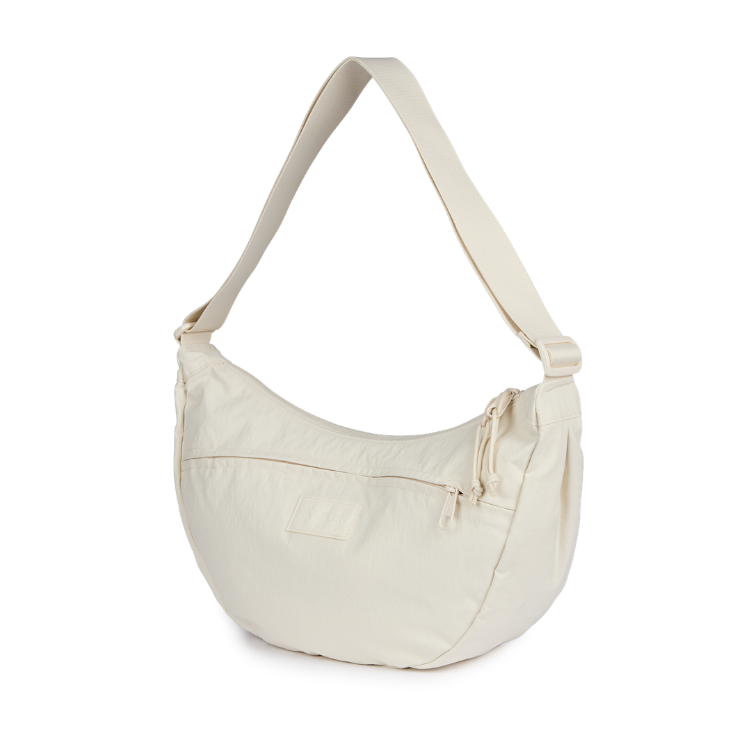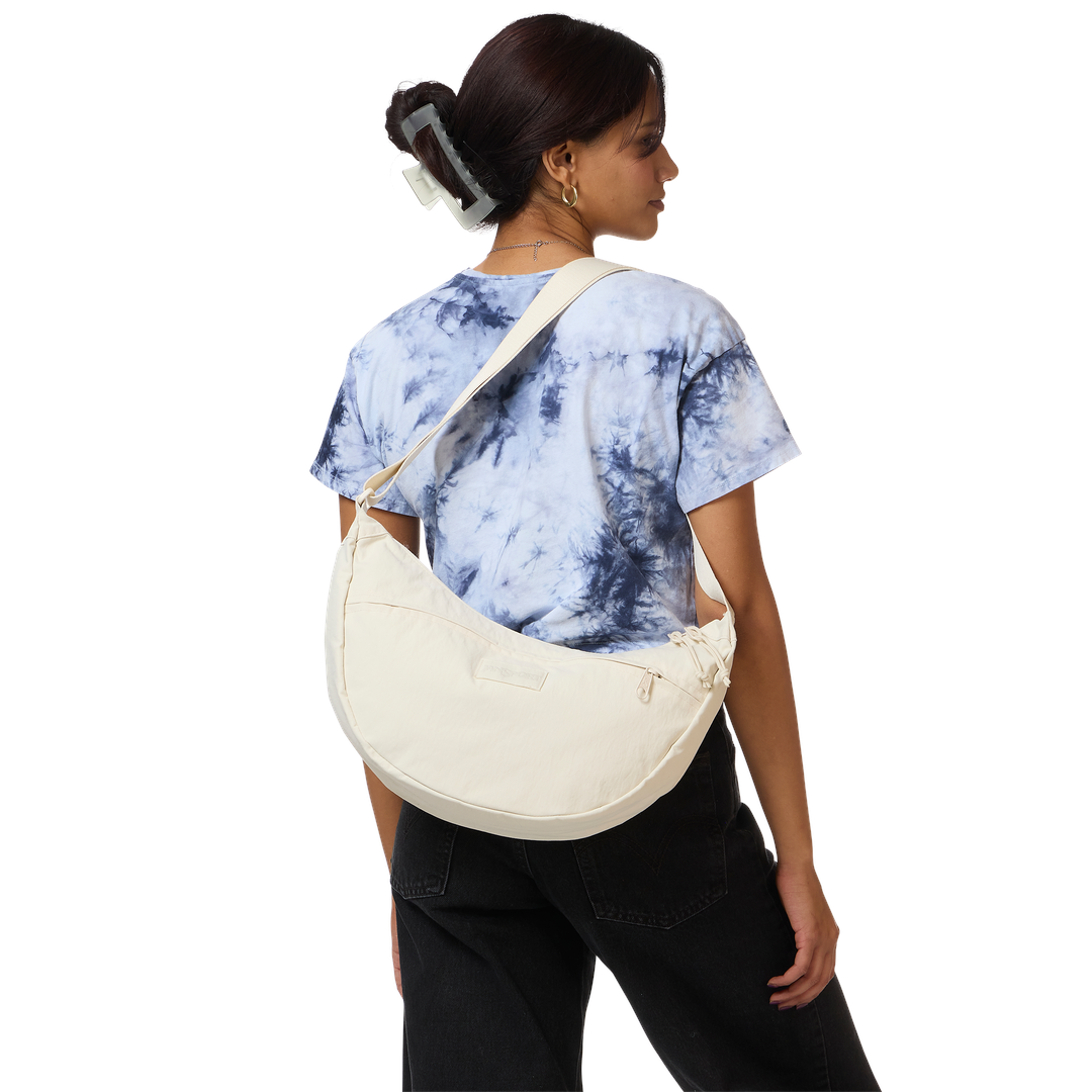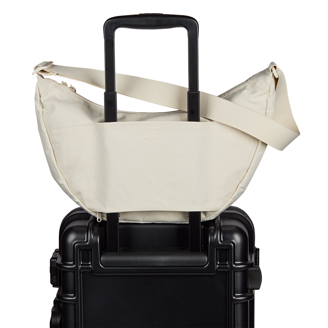 Soft and spacious for ease, movement, and everyday flow. The Unphased Crossbody Large features a slouchy silhouette made in part with 100% recycled crinkle nylon in a smooth, tonal color. Wear it crossbody or over your shoulder, or attach it to your suitcase with the trolley pass-through. Interior pockets and a roomy main compartment hold your backup layer, headphones, and whatever helps you move through the day with calm.