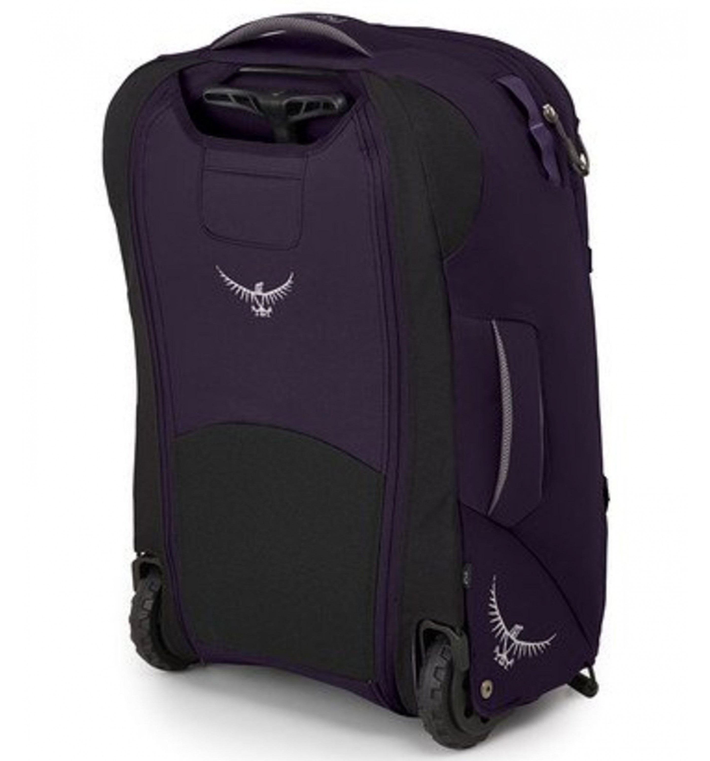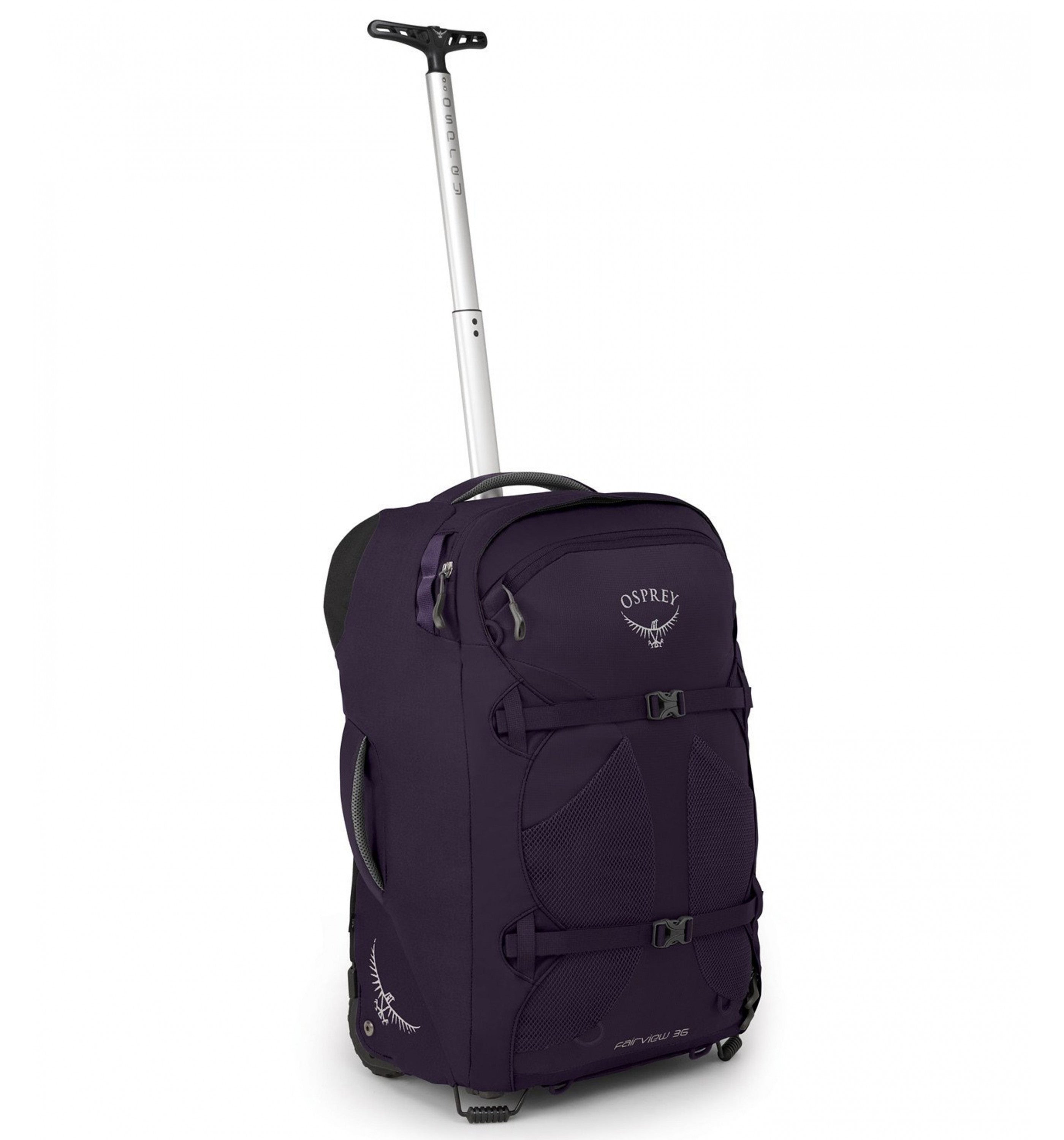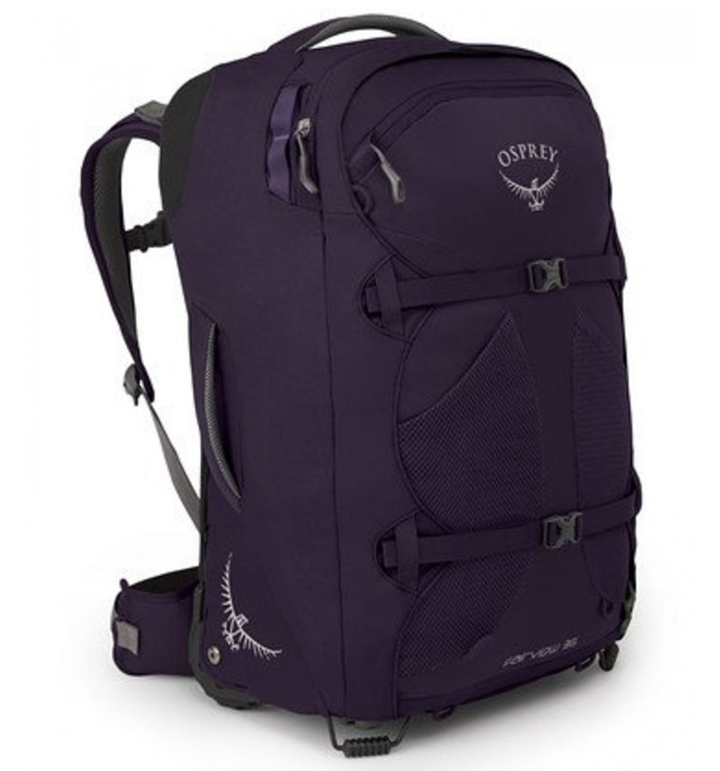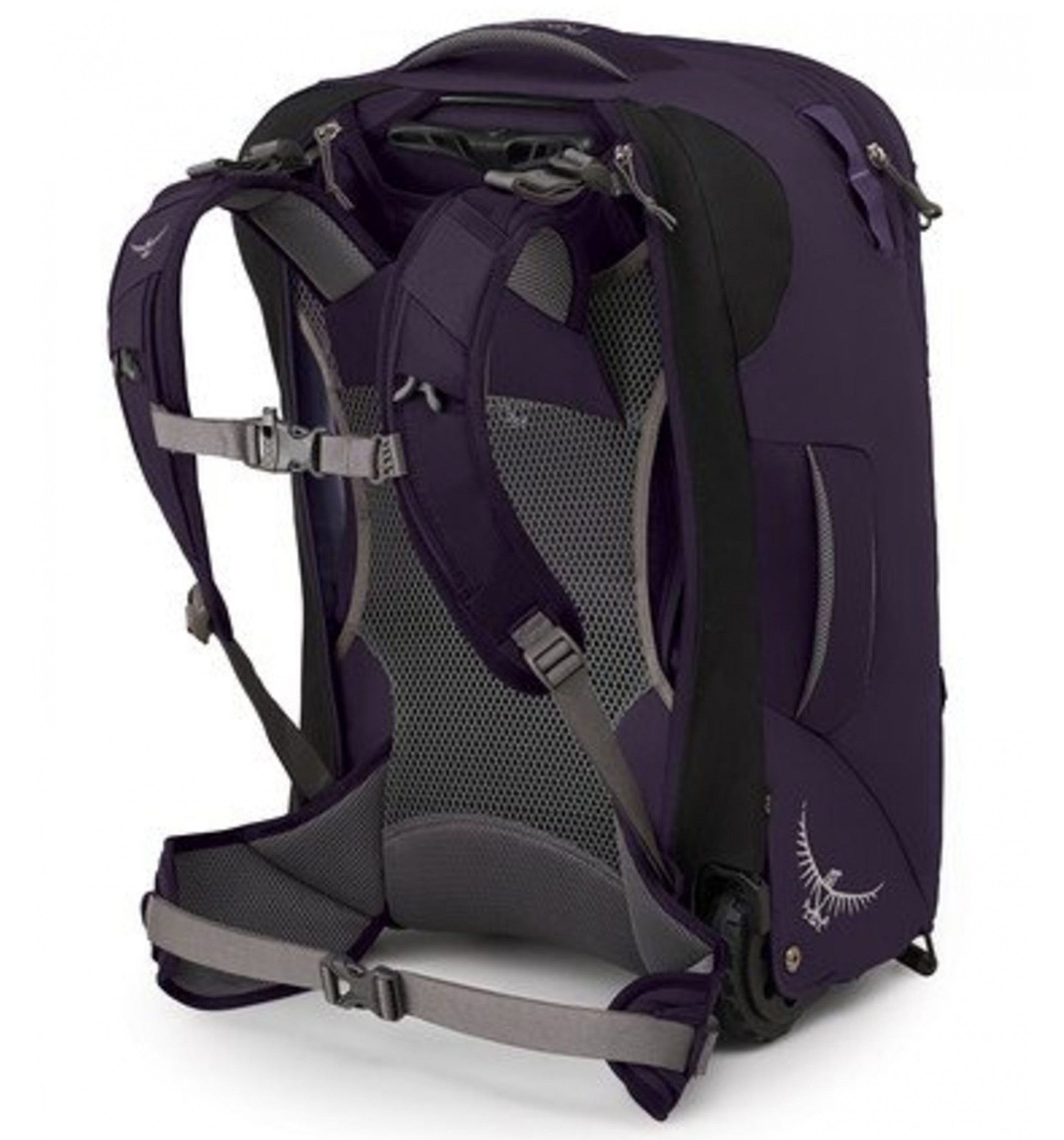 '- Durable chassis with oversized 90mm wheels - Stowable tensioned mesh backpanel with padded shoulder straps and hipbelt - Large front panel access makes for easy packing and unpacking - Front panel zippered top pocket for smaller items - Daylite® compatible attachment loops / external attachment points - Front mesh pockets - Dual front panel StraightJacket compression straps - Lower front panel lashing points for sleeping pad/external gear attachment - Padded top and side handles provide comfortable carry - Dual internal compression straps with fabric wings keep clothes neat - Zippered mesh pocket on inner front pocket wall