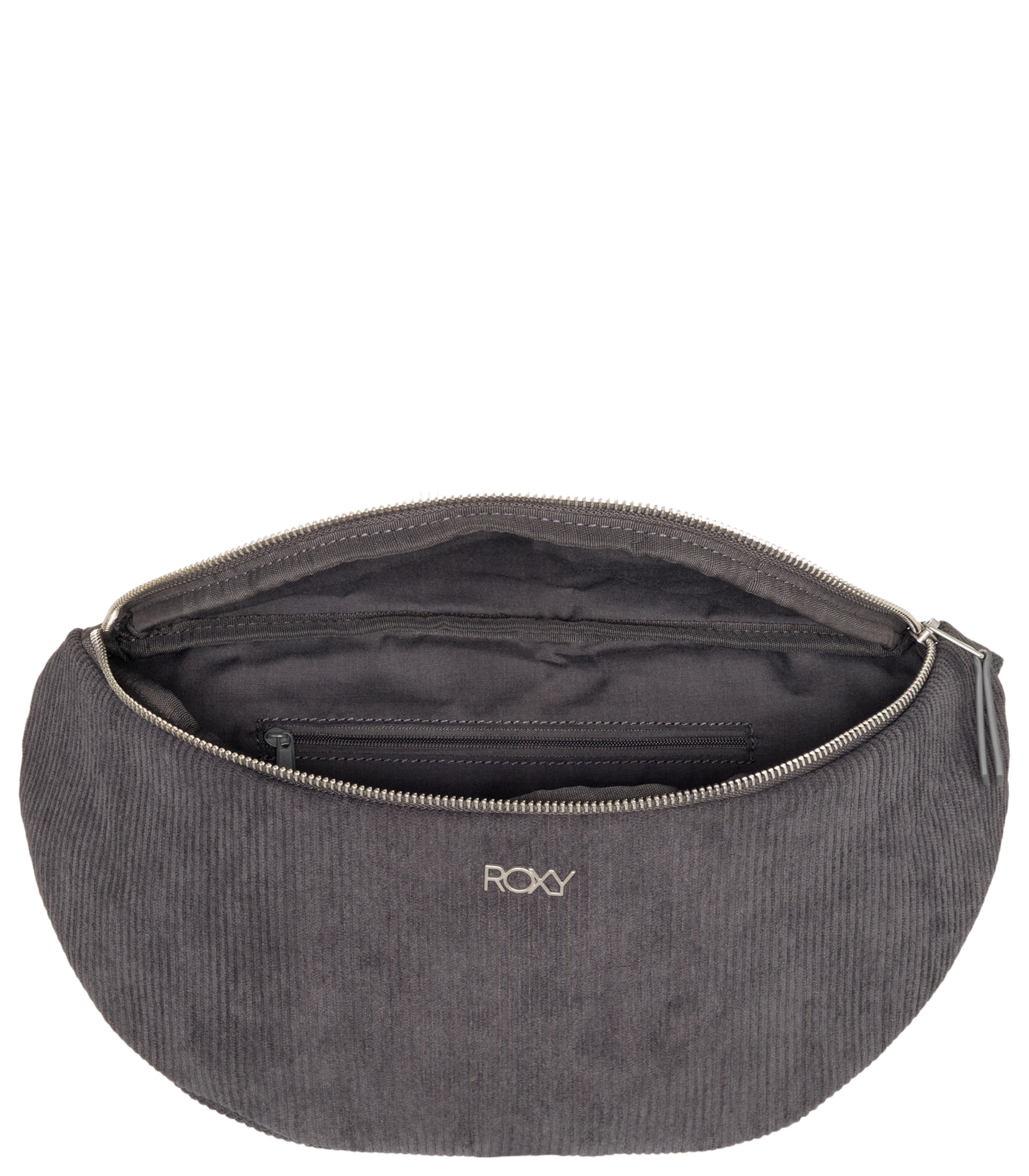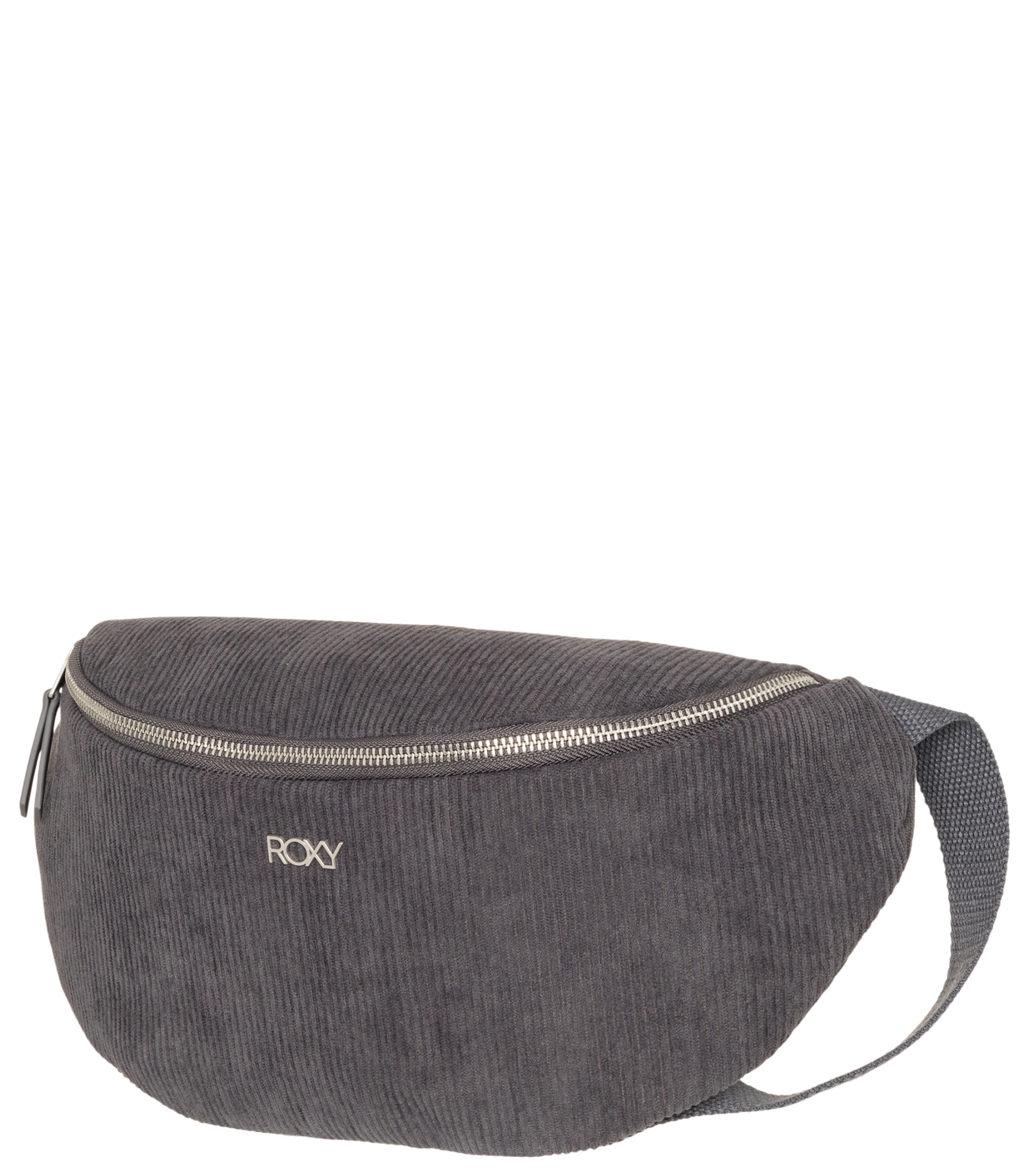- Features: Fabric: Polyester corduroy fabric Compartments: 1 main zippered compartment Pockets: 1 interior smaller zippered pocket Straps: Adjustable cotton webbing belt Branding: Roxy metal plate Other Features: Metal hardware Composition [Main Fabric] 100% Polyester
