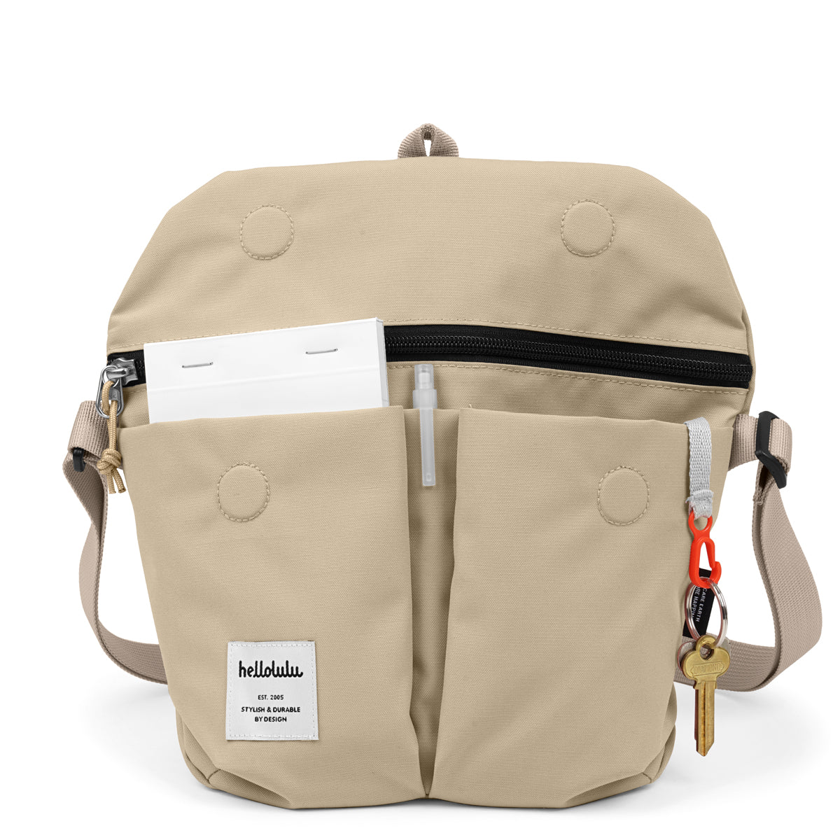 - Quick access front pockets with key clip and pen slot.