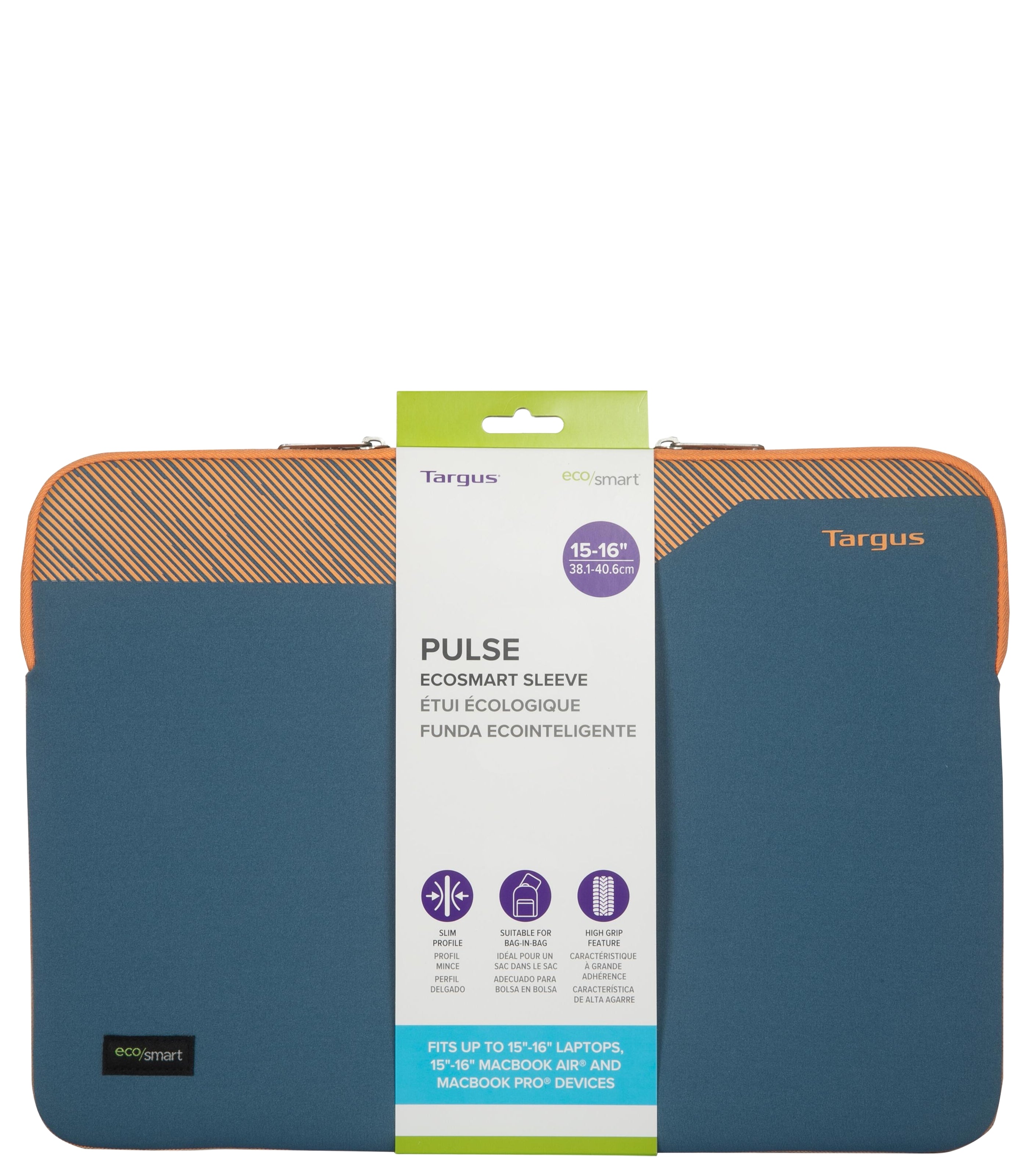 Features Form-fitting design adapts to fit 15-16” laptops Thin and lightweight Durable water repellent coating Printed grip for added tactile feel Neoprene laptop protection Interior brushed lining protects laptop against scuffs and scratches Dual zipper closure Sustainably produced with EcoSmart® technology