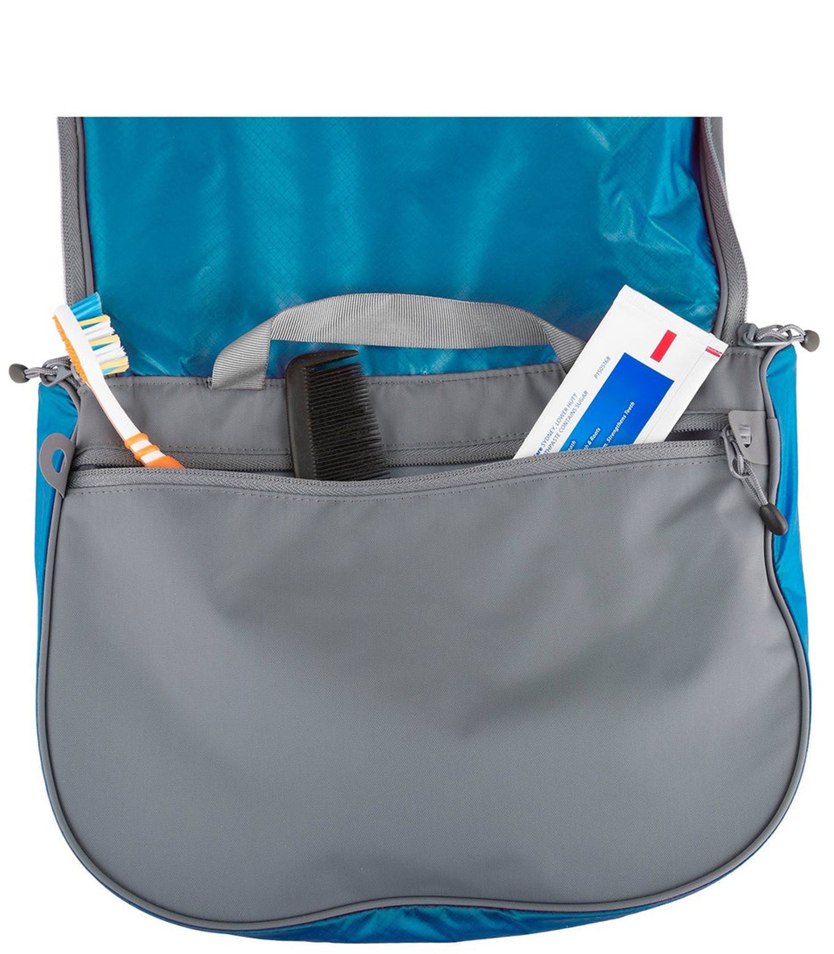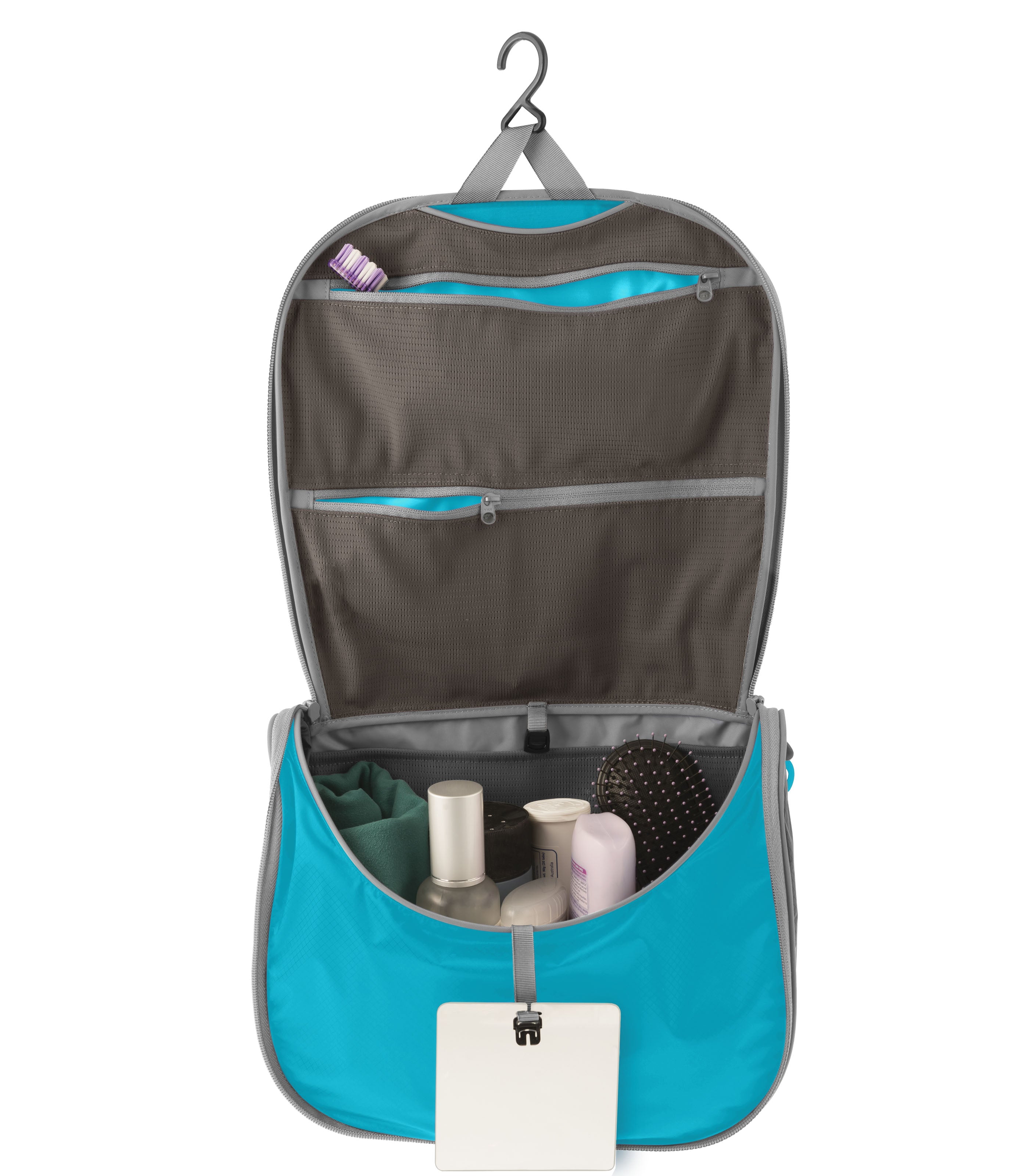 The Hanging Toiletry bags ultra-lightweight and water resistant Ultra-Sil fabric will keep your bathroom items contained and organised. Multiple internal zippered mesh pockets ensure the convenient organisation of your toiletries without adding bulk. Plus it's light, strong and hangs in your bathroom, on a tree branch or off your vehicle mirror for ease of access.Product Features: Super-light, strong and water-resistant Ultra-Sil fabric made with CORDURA® Nylon yarn Hanging design for easy use Internal mesh pockets provide content visibility Shatterproof mirror included Durable zippers and hypalon grab tags for easy and secure opening and closing Please note : Contents are for display purpose only
