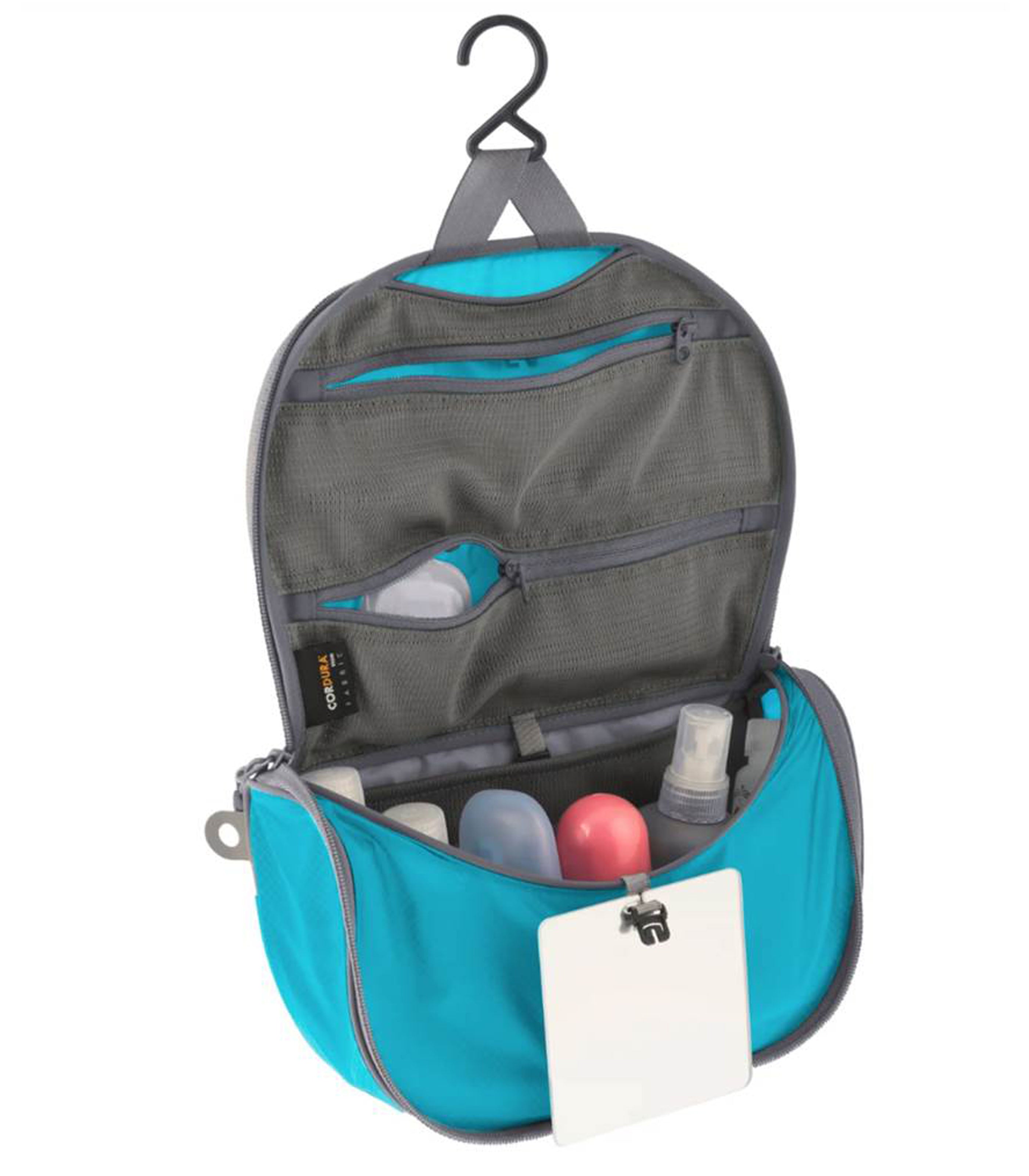 The Hanging Toiletry bags ultra-lightweight and water resistant Ultra-Sil fabric will keep your bathroom items contained and organised. Multiple internal zippered mesh pockets ensure the convenient organisation of your toiletries without adding bulk. Plus it's light, strong and hangs in your bathroom, on a tree branch or off your vehicle mirror for ease of access.Product Features: Super-light, strong and water-resistant Ultra-Sil fabric made with CORDURA® Nylon yarn Hanging design for easy use Internal mesh pockets provide content visibility Shatterproof mirror included Durable zippers and hypalon grab tags for easy and secure opening and closing Please note : Contents are for display purpose only