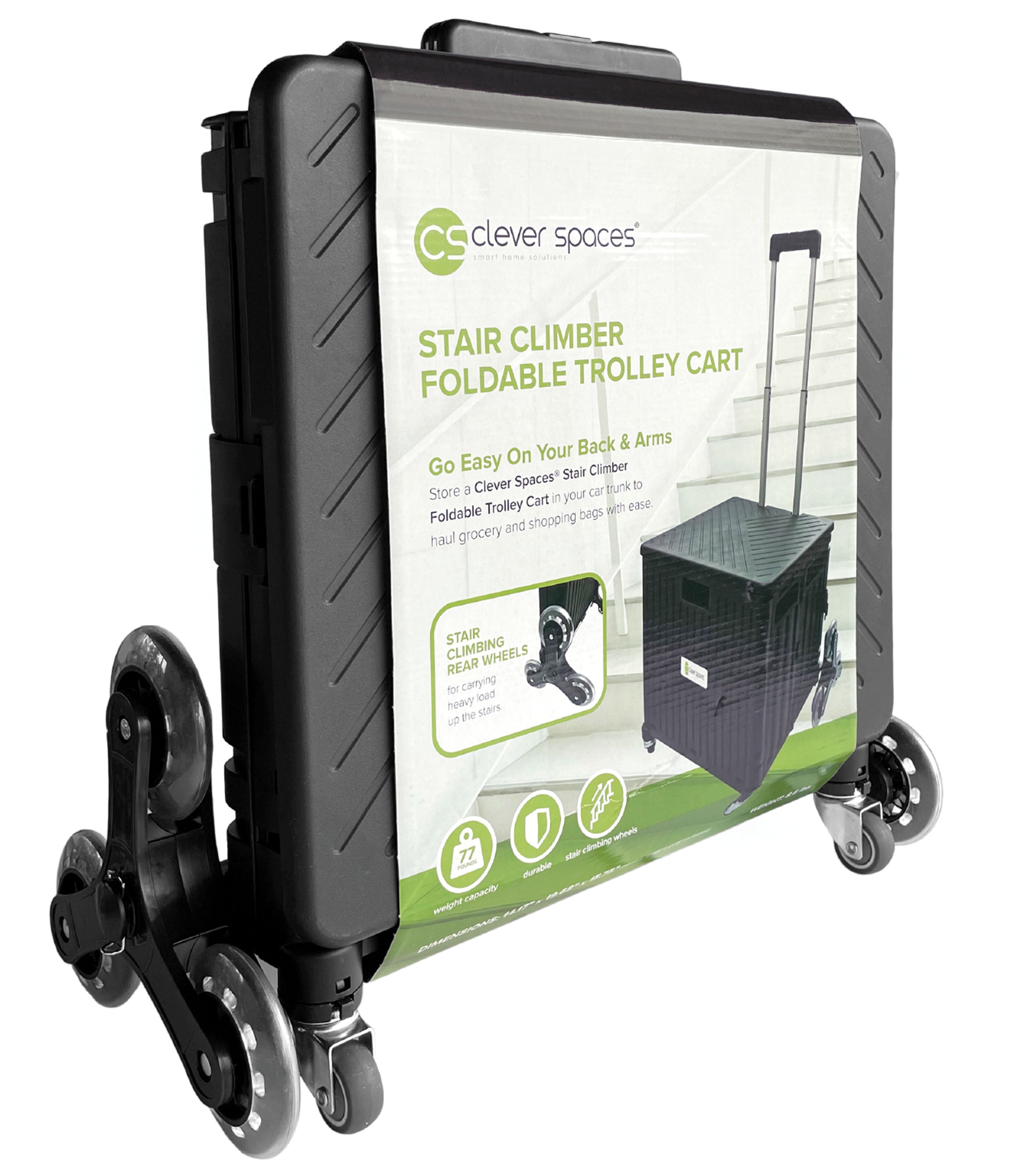 Make transporting items when you're on the go easy with Clever Spaces Stair Climber Foldable Trolley Cart with Lid. Also with a sleeker design and new slide-lock feature, The Clever Spaces Stair Climber Trolley is designed with a pair of rear oversized wheels that make rolling over curbs, stairs, and obstacles so much easier. Great for hauling groceries, laundry, and more, this trolley can move across almost any surface. It comes with a lid to cover the trolley crate when in use or when used in storing items. Folds flat to just 2.75 inches for portability and storage.