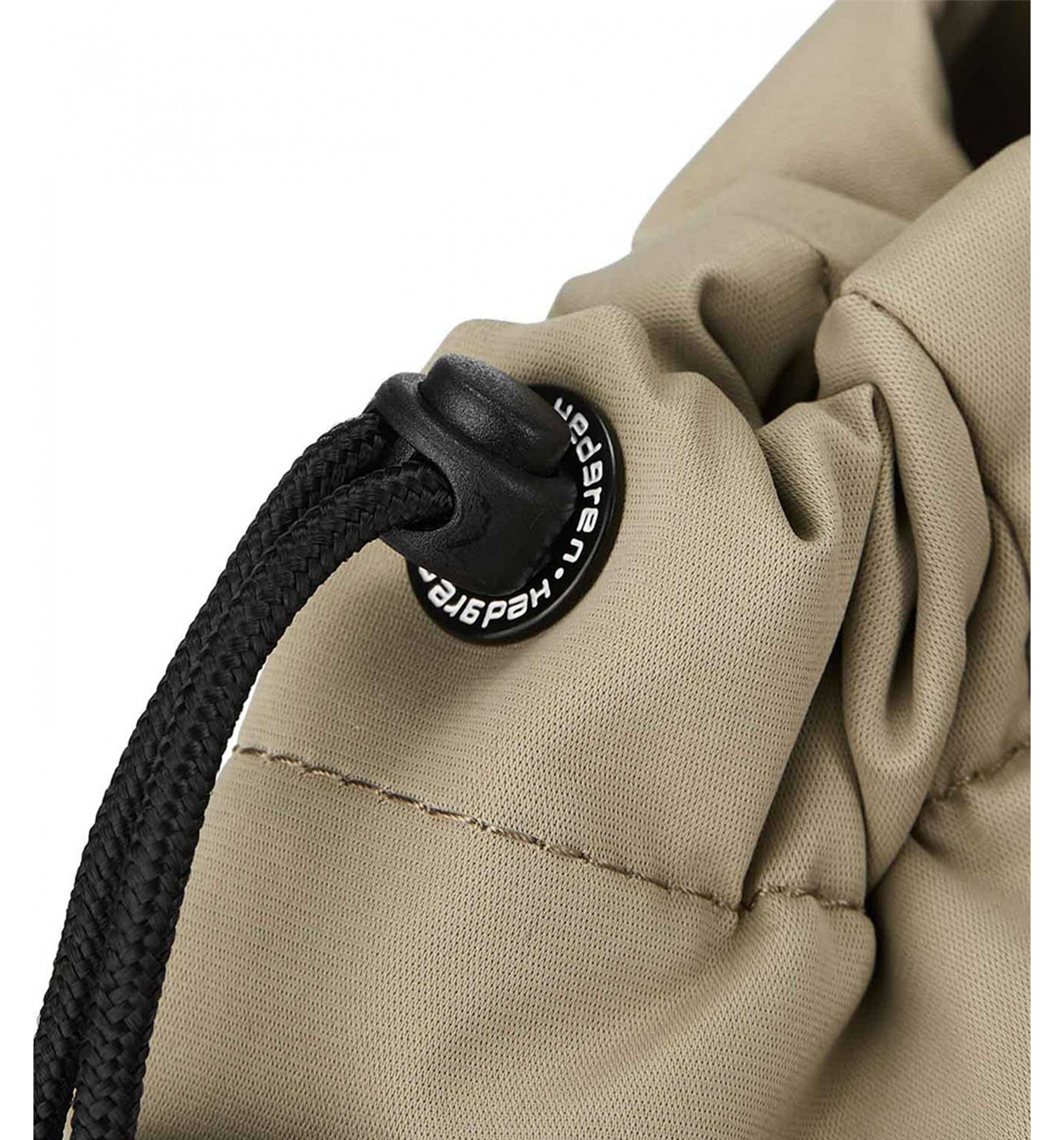 '-INTERIOR FEATURES -Main compartment has one zippered pocket inside -Main compartment has one open pocket and key chain inside -EXTERIOR FEATURES -Adjustable, removable shoulder strap -Back zippered pocket -Two snap-button side pockets -Drawstring top to change the shape of the bag -Black hardware -Water- and dust repellent material Two-tone cube hanger