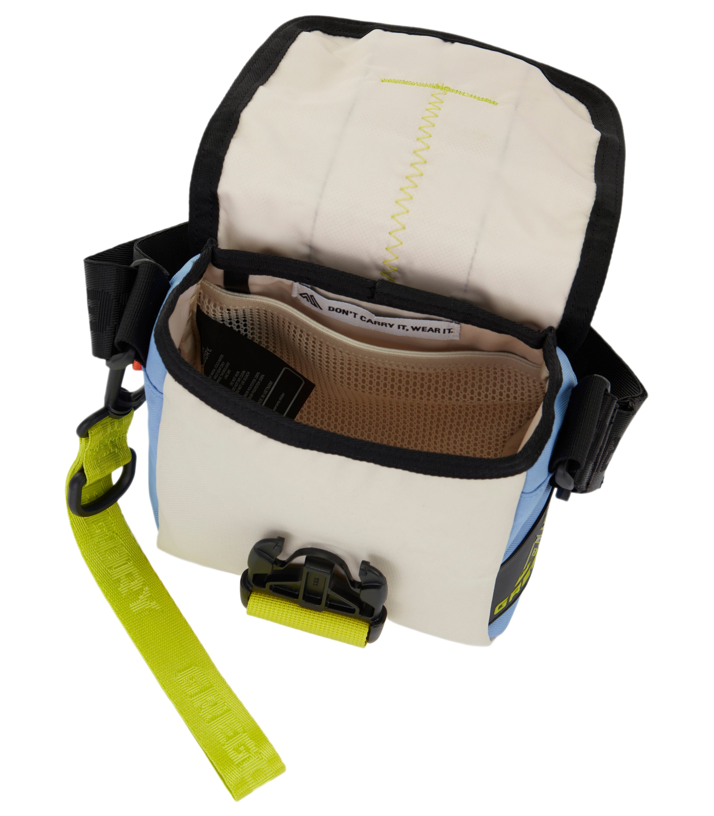- Buckle design pouch includes functional mesh pocket and rear pocket. {n}