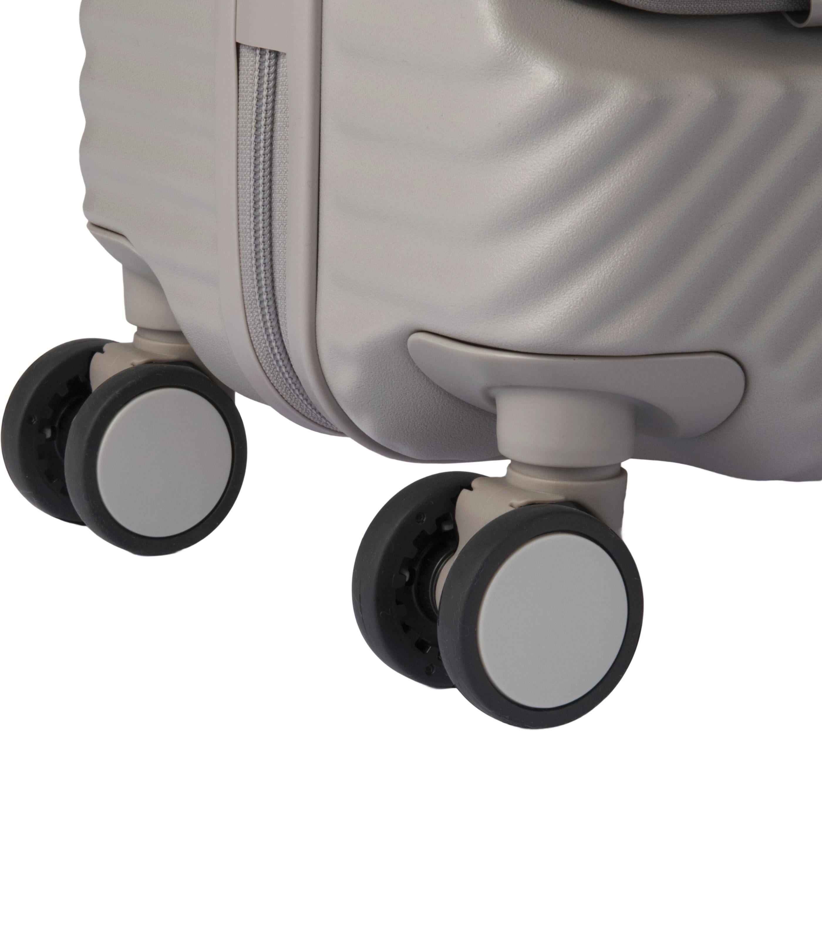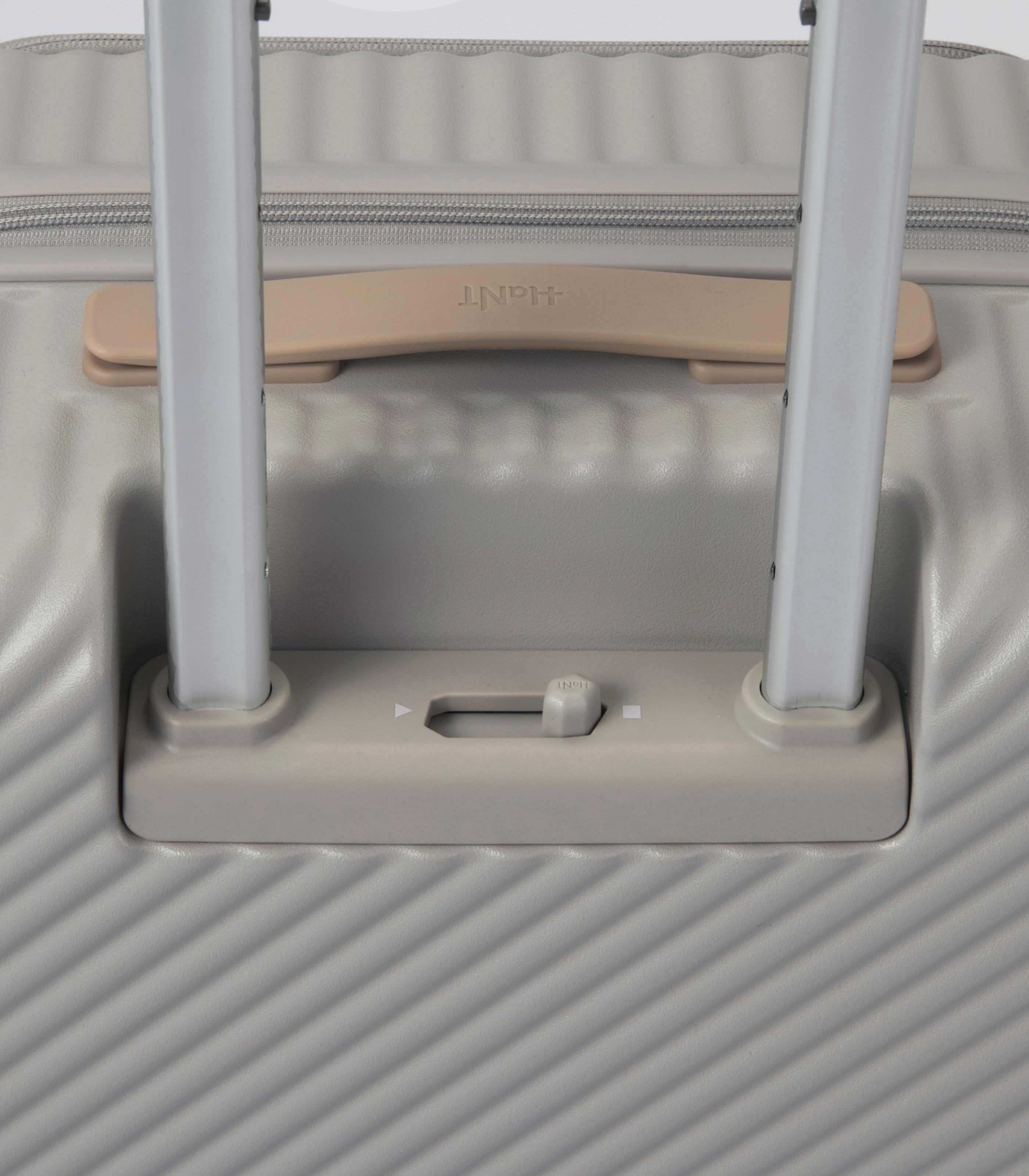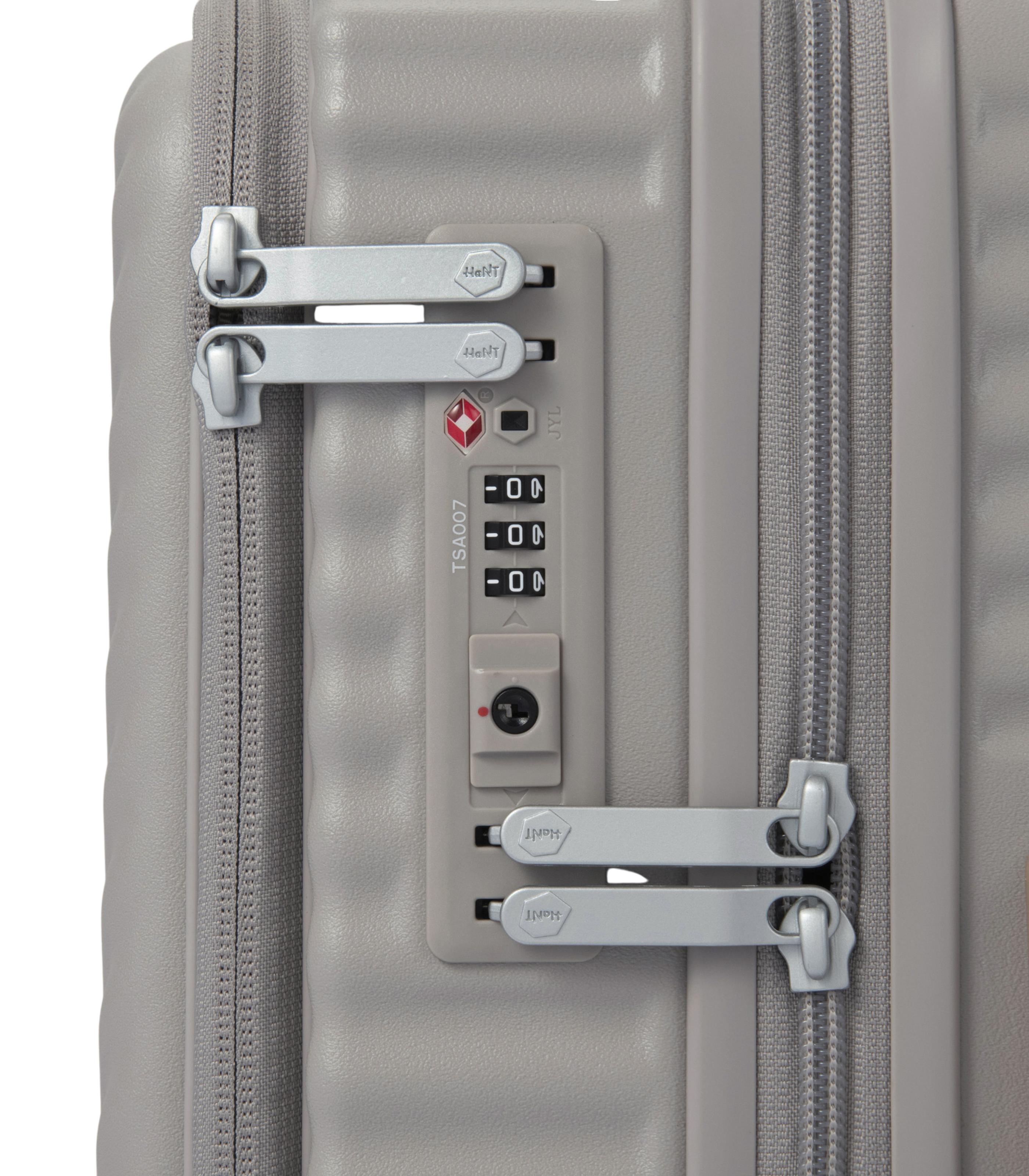 - Caster Stopper: One-touch button at hand level to prevent the suitcase from rolling, especially useful on trains.