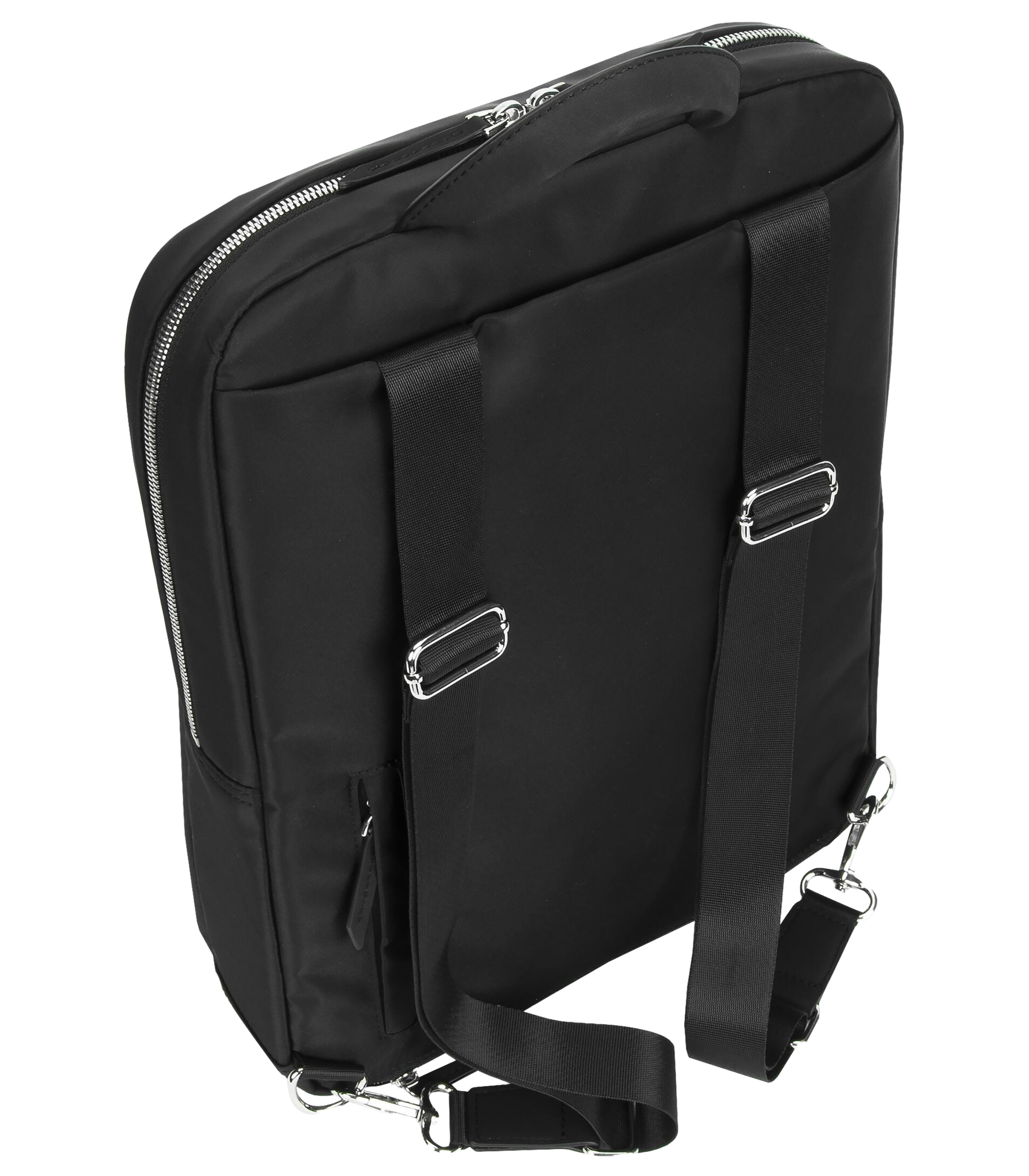 Features Single compartment with padded laptop cradle Compatible with Macbook Pro 16" Front zippered pocket Hidden back panel pocket for added security Hideaway, adjustable shoulder straps Comfortable top carry handle Premium metallic trim High-density water-repellent twill nylon and leatherette accents